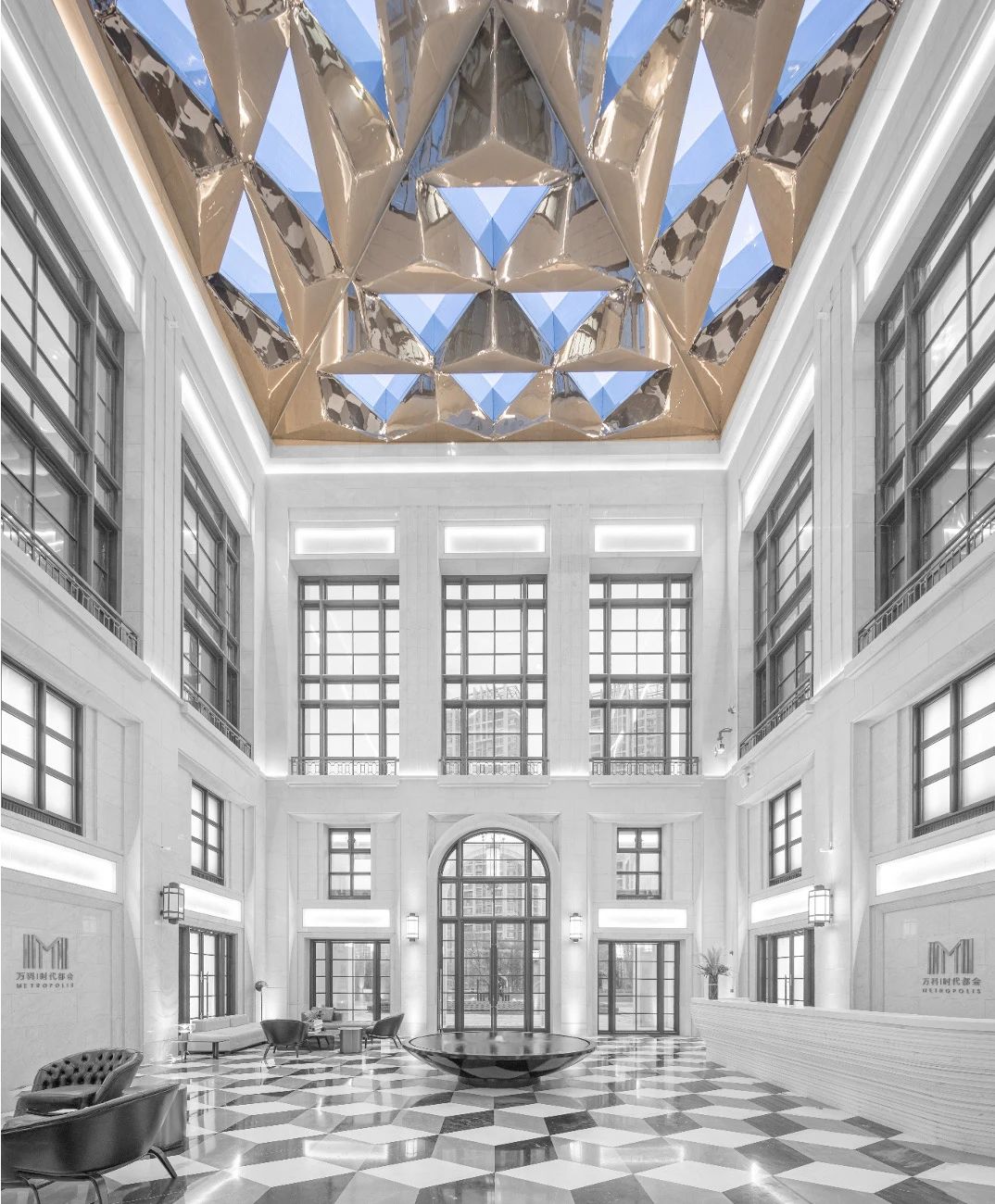 无锡·万科·江阴时代都会,这一最新作品中,都易在经典都会立面基础上,融合了现代几何吊顶,在示范区大堂运用钻石镜面切割工艺打造不锈钢吊顶,混搭传统石材,经典元素与时尚语言有机碰撞,给人以多重秩序空间下的艺术感受。
