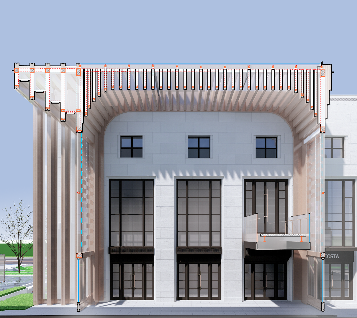 都易在创新研发中,加入柔性设计语言,赋予典雅建筑细腻的柔美性,探索传统观念中刚性的建筑,如何与时尚女性视角相融合,拓展建筑美的受众面。与金地一同研发名仕3.0课题上,都易就运用到这一研发成果:不仅丰富了示范区流线的趣味性,通过柱廊形式围合成一个内庭院空间,还丰富了空间层次,建筑与景观相互渗透。售楼处主体、光之拱廊、柱廊空间、光幕环岛与时尚T台一起组成完整的参观销售动线。建筑空间以4.8M为模数来组织空间,内部拱券造型以45°角正四边形进行组合形式,形成3*3*3的十字拱券空间序列。在古典的建筑体量中,结合现代材料,借鉴古典装饰造型,形成独具创新的金属十字拱廊造型,通过光影关系,丰富场景空间变化。柔性视角下,运用现代拉丝仿铜不锈钢的材质与修长十字拱的三维构图将典雅建筑中的细腻性完美的展示了出来。