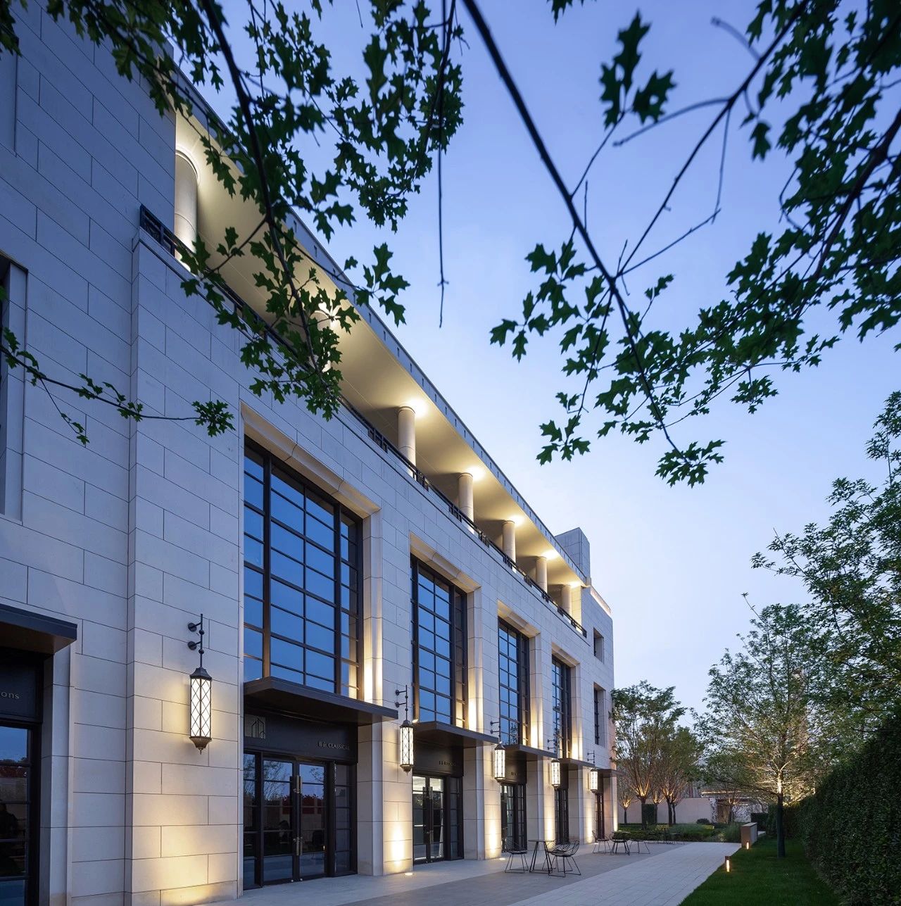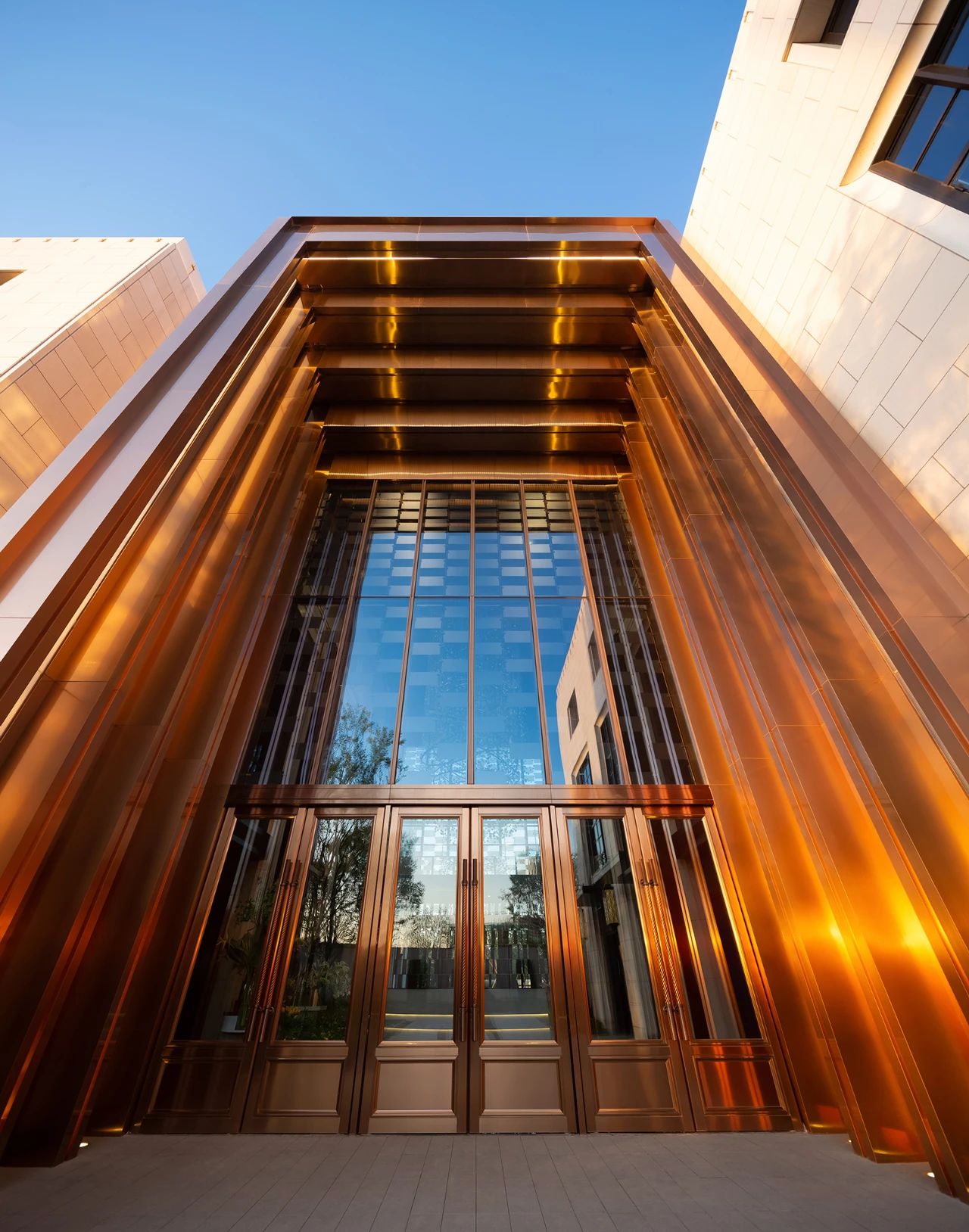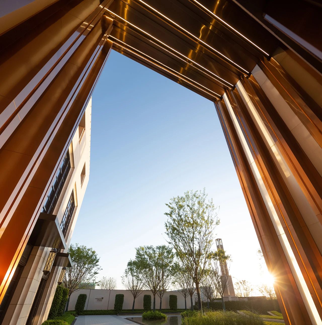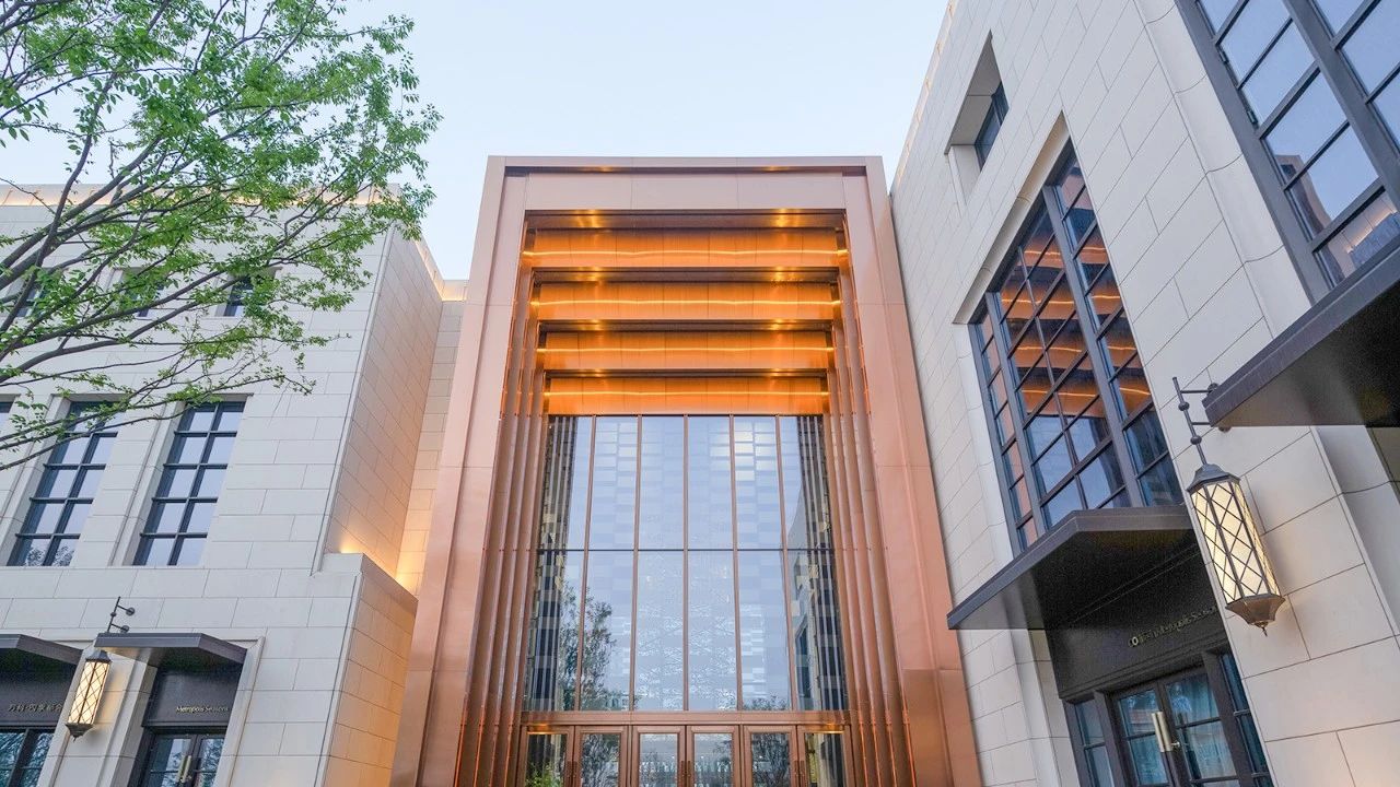 外部展现:在南北两座建筑体量保持经典大都会风格的同时,中间段的体量作为至关重要的“连接件”,突出了与时俱进的设计感,层层退叠的拉丝仿铜门框,配合大面自由洒落的片状亚克力,冲击着来访者的视觉神经,令人联想起不久前竣工的上海外滩金融中心:时尚的铜色与通透的内部空间,与简洁舒展的景观设计一起,体现出21世纪人居环境的历史与未来的连接。