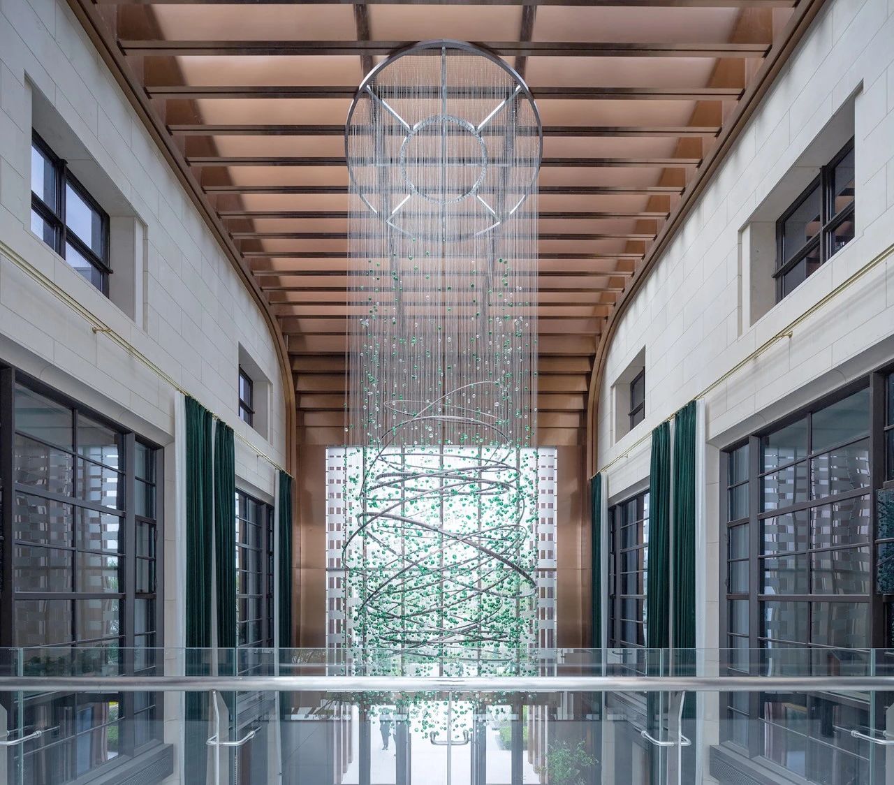 内部展现:通过层叠的门框进入室内后渐渐收分为一个类弧形的大堂空间,玻璃连廊配合生机盎然的空间装置,一瞬间将空间的氛围烘托至高点。