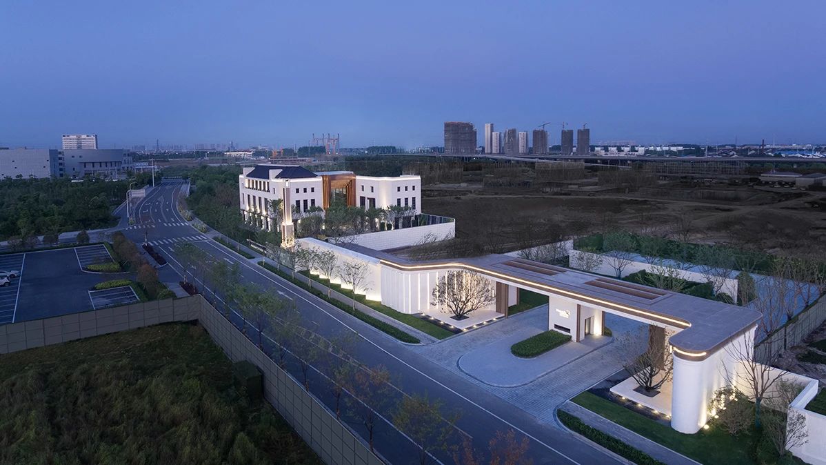 示范区的主要入口设置在山墙面之间,而真正的建筑主立面则成为了船舫南路上的重要对外展示面,经典的三段式构图,横向三段与纵向三段,在道路的交叉口上制造了一个强烈的精神标识。