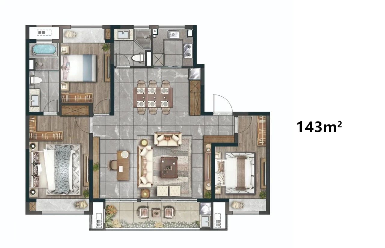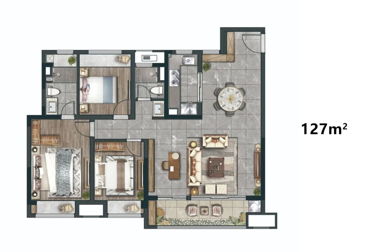 在106m²(三房面宽)、127m²(四房面宽)户型上,不仅出现了两开间宽景阳台,加宽了书房的面宽,更是在主卧空间的营造上,出现了豪华住宅和五星酒店套房才有的成套设定,包括独立的衣帽间和“L”形的卫生间动线。