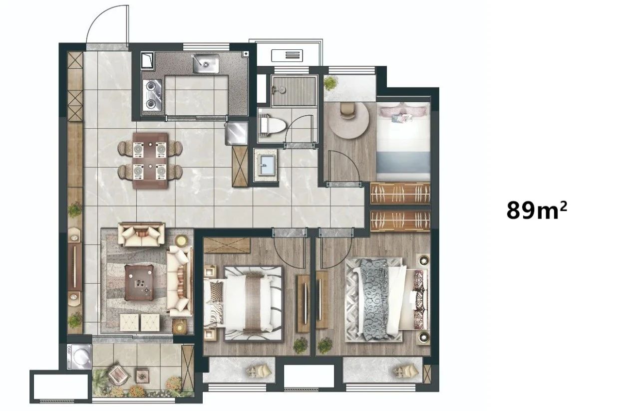 例如建筑面积仅89m²的小户型,设计上依然做到了“3面宽+双南卧室”的格局,卫生间采的三分离设计、双南卧室全飘窗设计也是精细化的产品特征。
