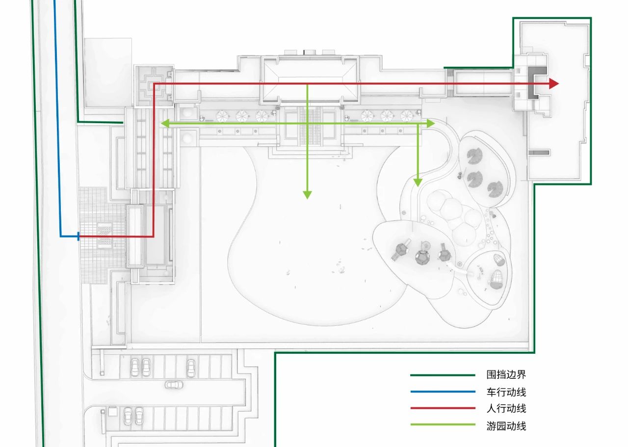 都易的设计策略来自对街区引导性的研究,在有限的区间里延长并丰富参观流线,打造沉浸式体验,利用前置的街角公园,完成“生态停车场”和“市民舞台”功能,建筑主体内的接待、示范、展示功能被高度地组织起来,轻巧又不失仪式感。