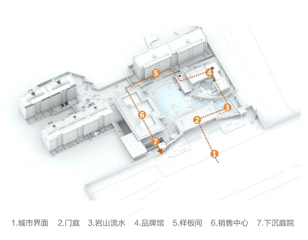 而在江南悦的景观营造中,要在相对有限的空间里,解决“展示、销售、品牌、接待”等具备公共性的功能,同时还要容纳“住宅、康养”两条完全不同的动线设置,非常有挑战。
