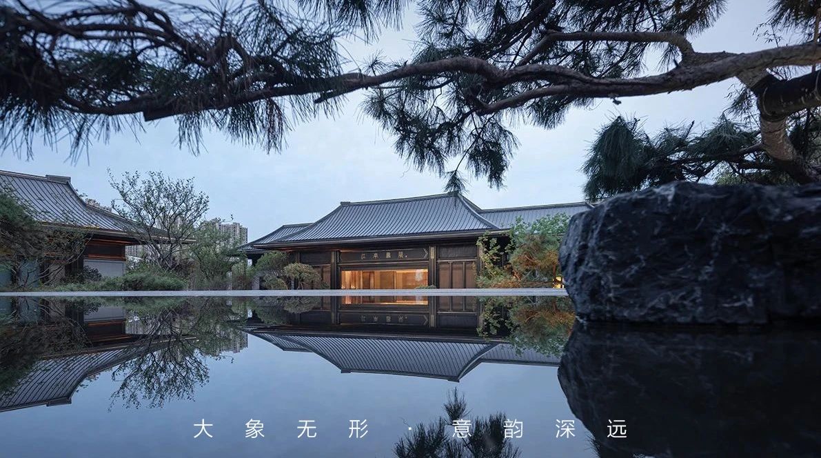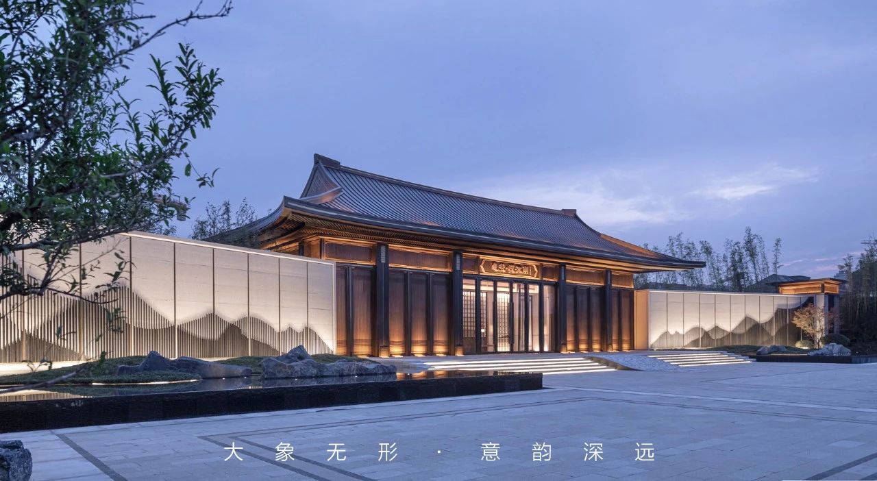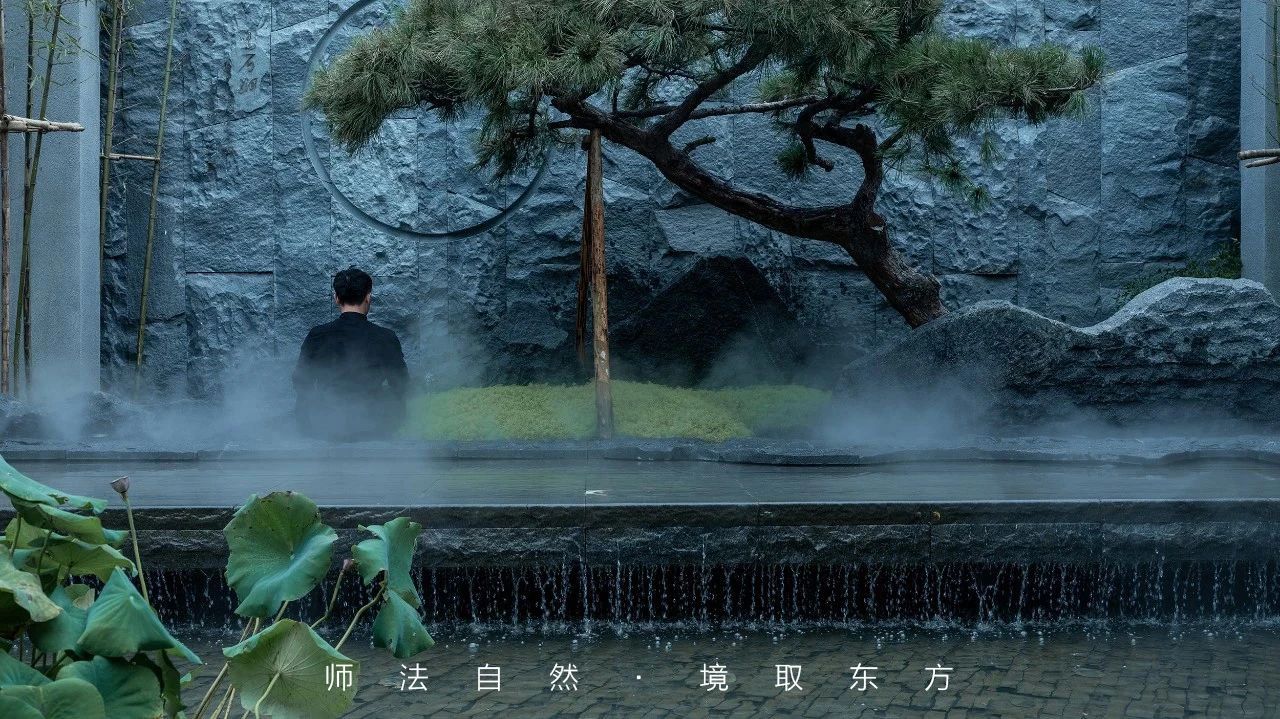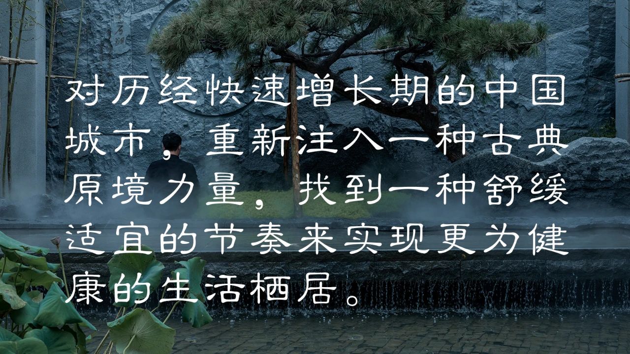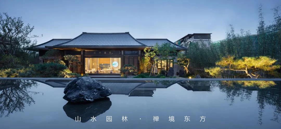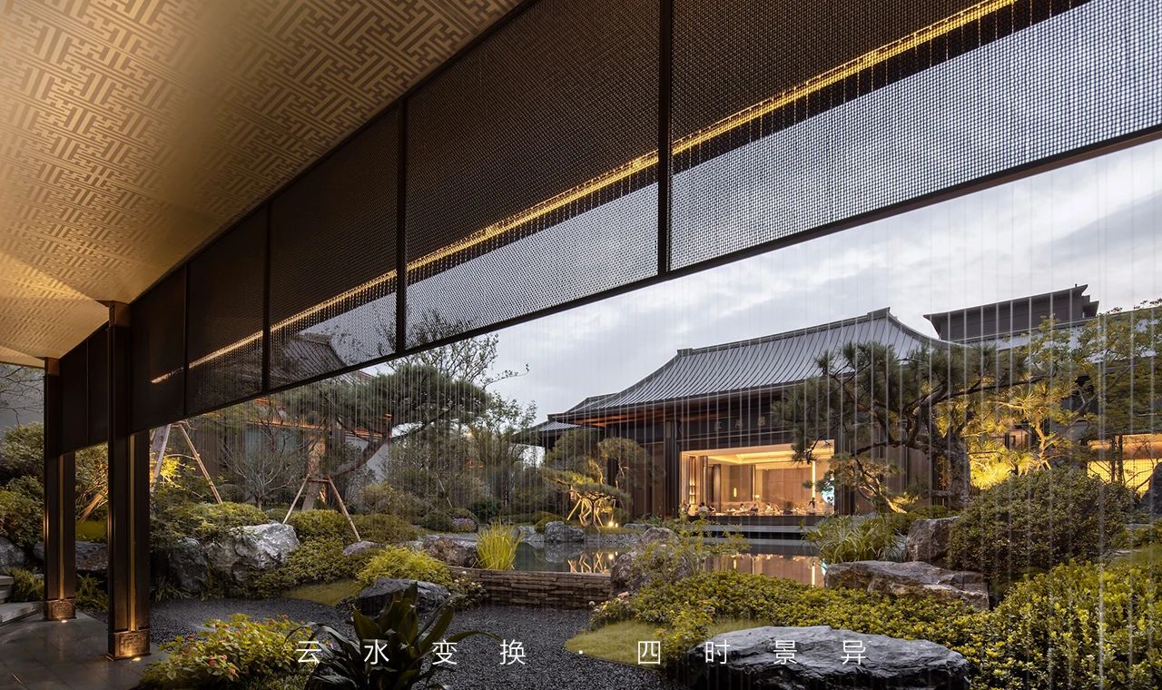 现代格栅+石材景墙手法营造出三重叠山效果,结合景观静水倒影,打造属于当代的水墨意境。