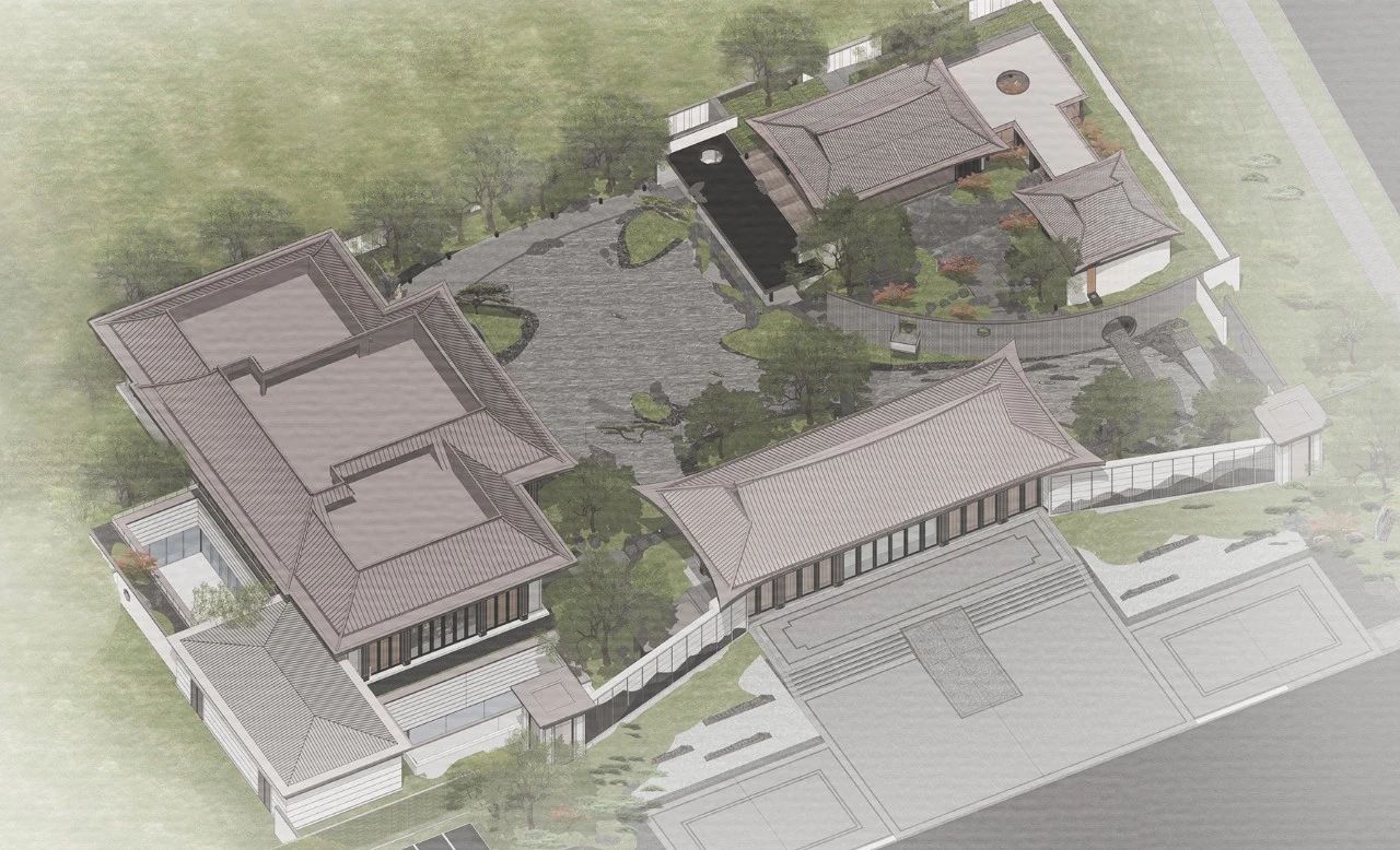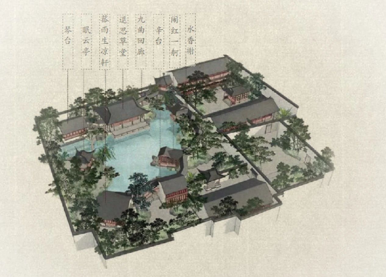 示范区的景观意向对标吴江名园“退思园”,这座园子最大的特征在于空间组织上的丰富性和紧凑感,其独到之处就是花园以水为中心,建筑和布景沿水而筑,水面的收分起合,暗示着功能动线的不同区位:在入口大门之后,西侧的“无尽桥”(取诗“但去莫复问,白云无尽时”),预示着居住条件改善的进取之意,连接大区住宅的接待区域;东侧的“云起桥”(取诗“行到水穷处,坐看云起时”)是为生命到达一定的阶段的写照,连接着康养产品的示范区域。两个不同的接待区在北侧的“望月桥”(夜雨连明春水生,娇云弄月欲微晴)进行连接,完成整个示范区的洄游动线。