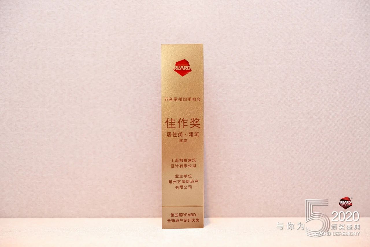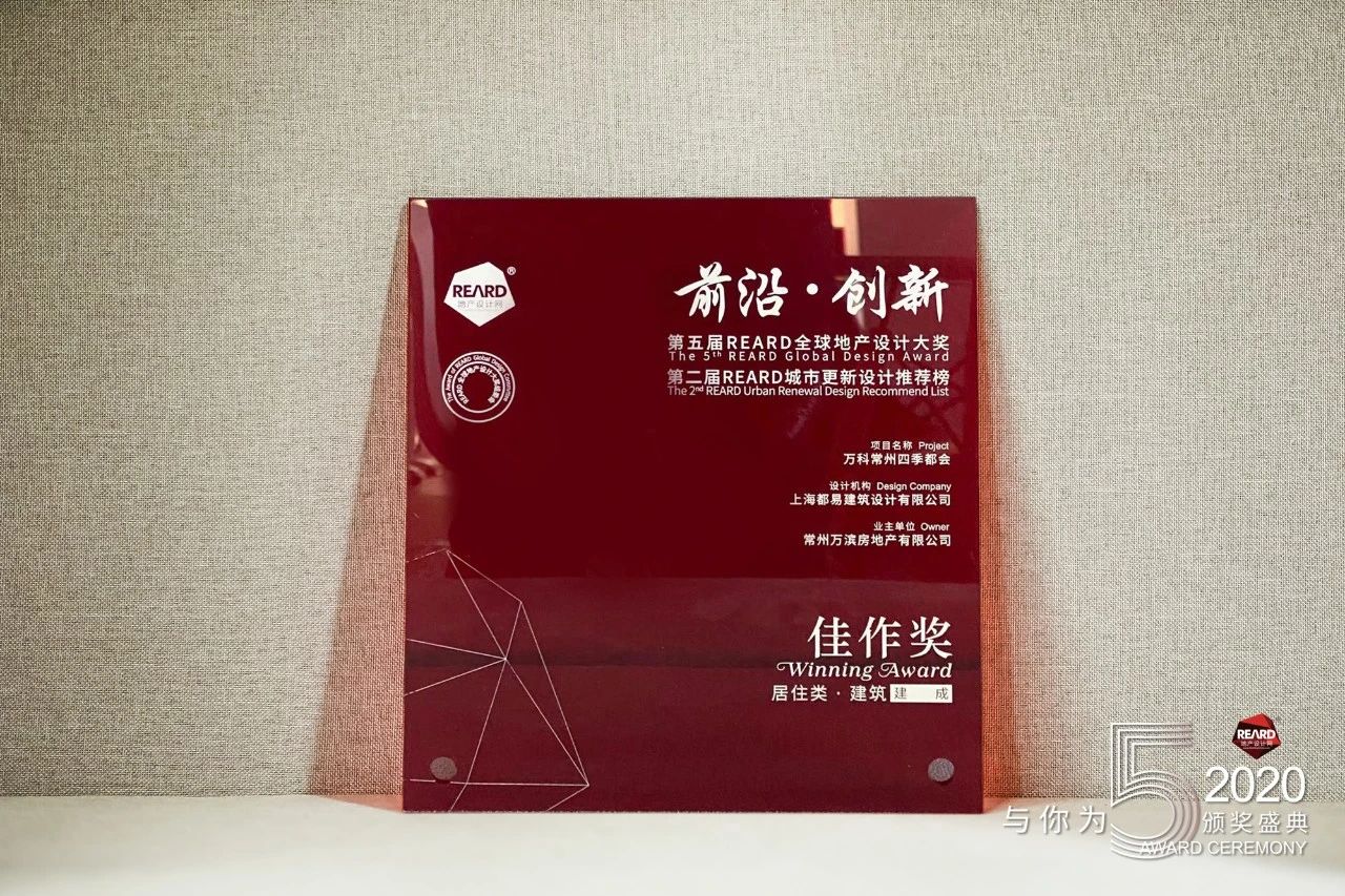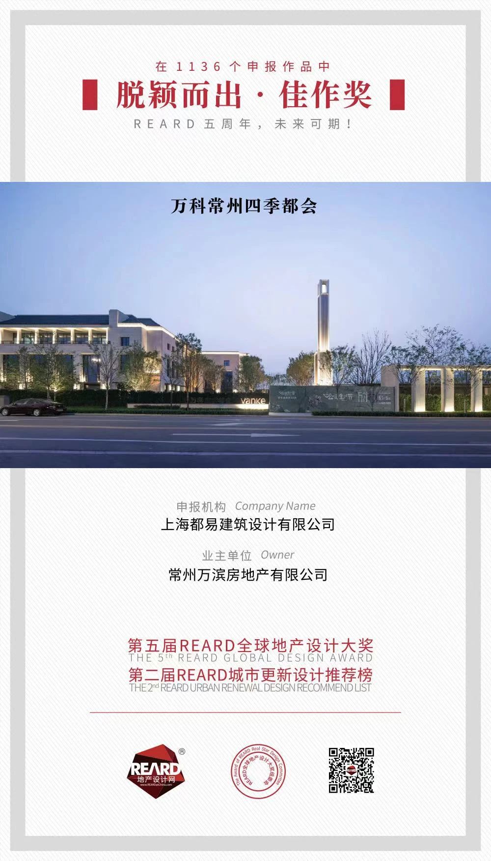 2020年11月28日,第五届REARD全球地产设计大奖颁奖盛典于上海隆重召开,都易设计作品万科·常州·四季都会从1136个申报作品中脱颖而出,获得居住类·建筑佳作奖。