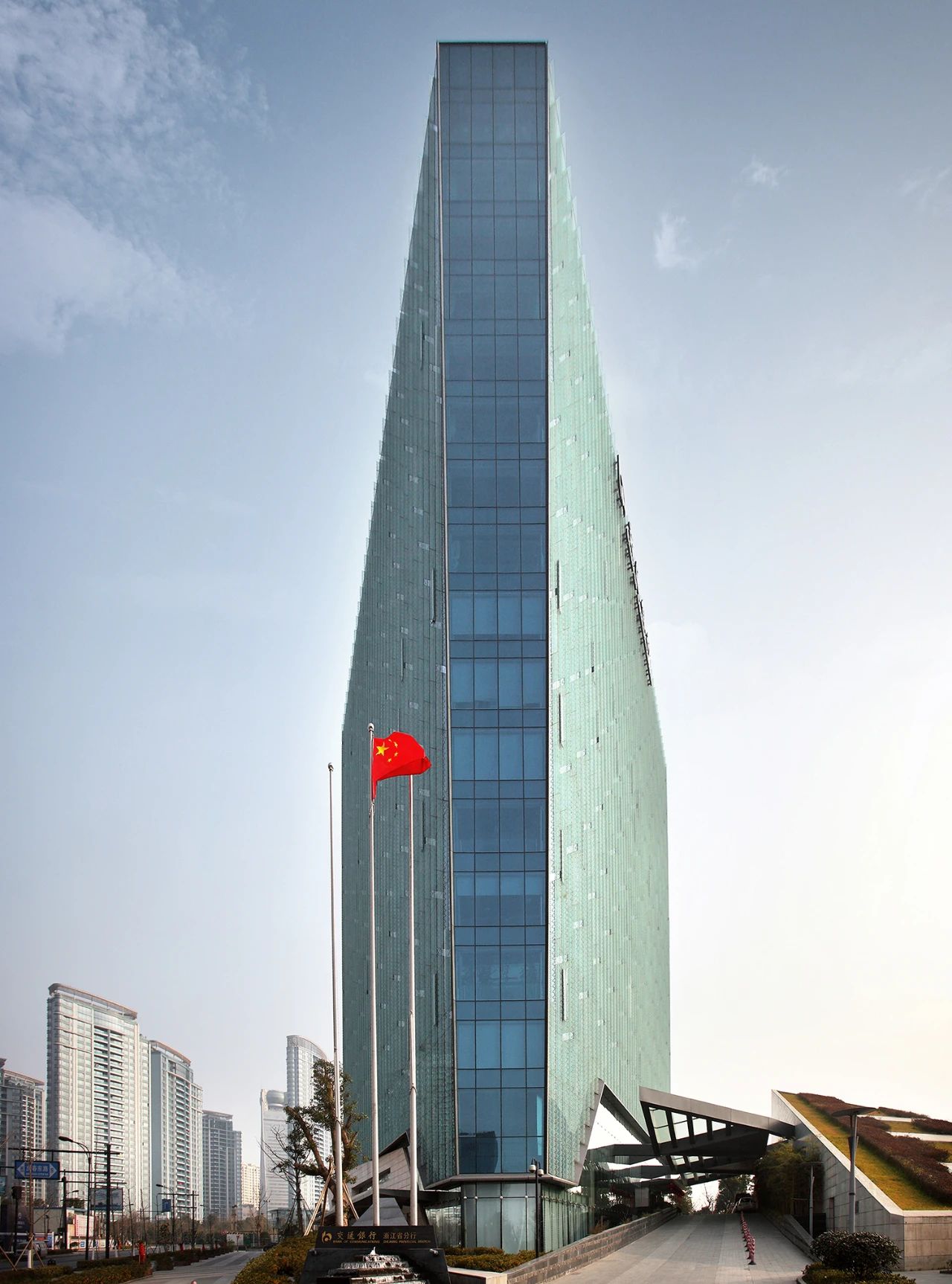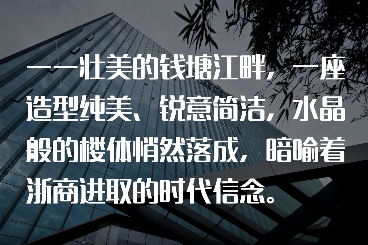 它造型纯美、锐意简洁,水晶般的楼体座落于幽雅而精巧的石质墩座之上,散发着钻石般尊贵质感。整个建筑如同创新进取的浙商精神一样,富有韧性,在壮美的钱塘江畔熠熠生辉。