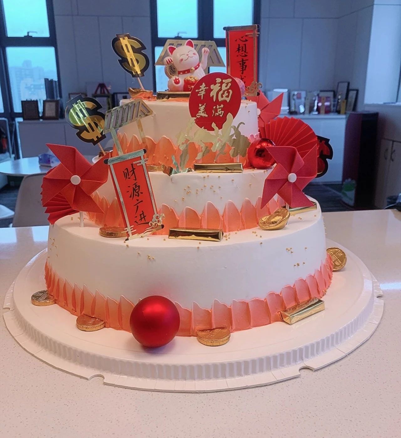 三层的大蛋糕、富态的招财猫、喜庆红红的饮料、节节高升的甘蔗,将节日的喜庆气氛烘托的浓浓的。