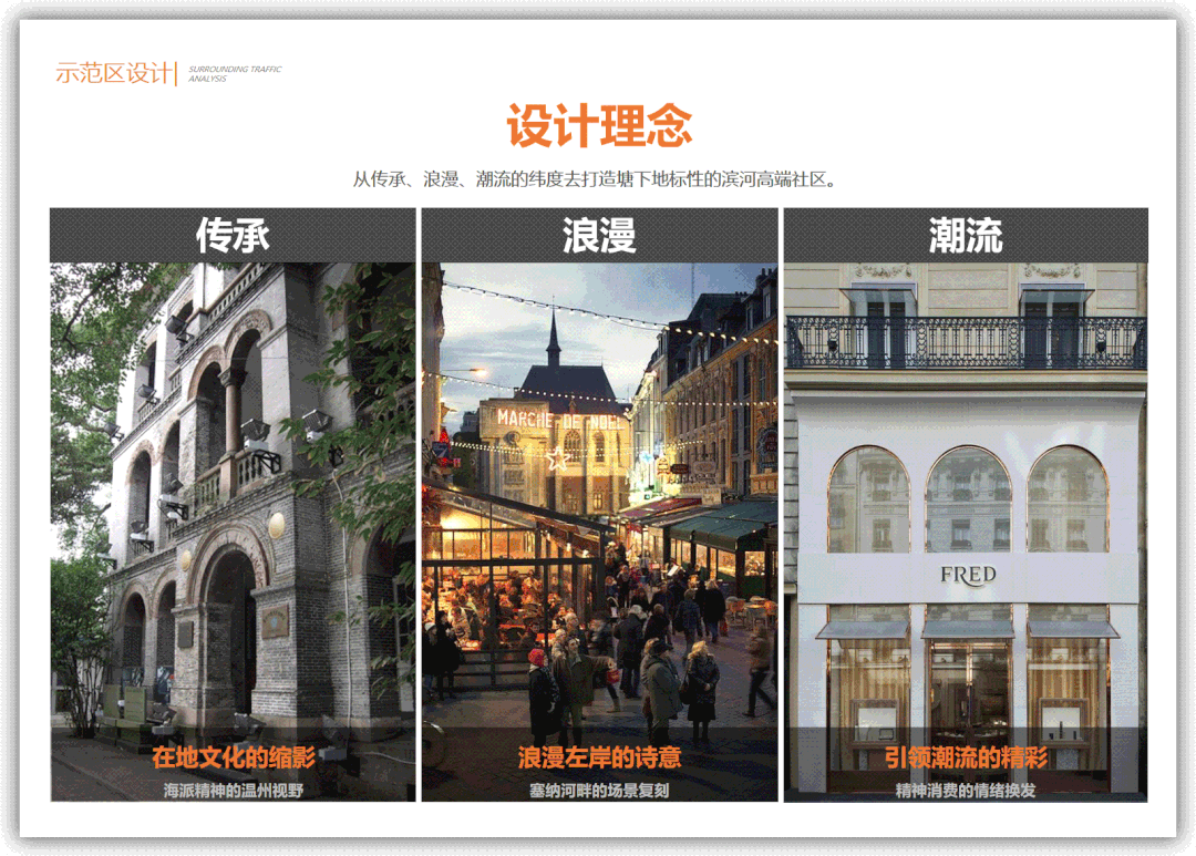示范区设计的板块是本次分享的重中之重,杨总通过“传承、浪漫、潮流”这三个关键词的设计理念展开进行案例讲解。从示范区的选址、流线分析、平面功能分析、商业街区主题打造全面讲解了示范区的设计。