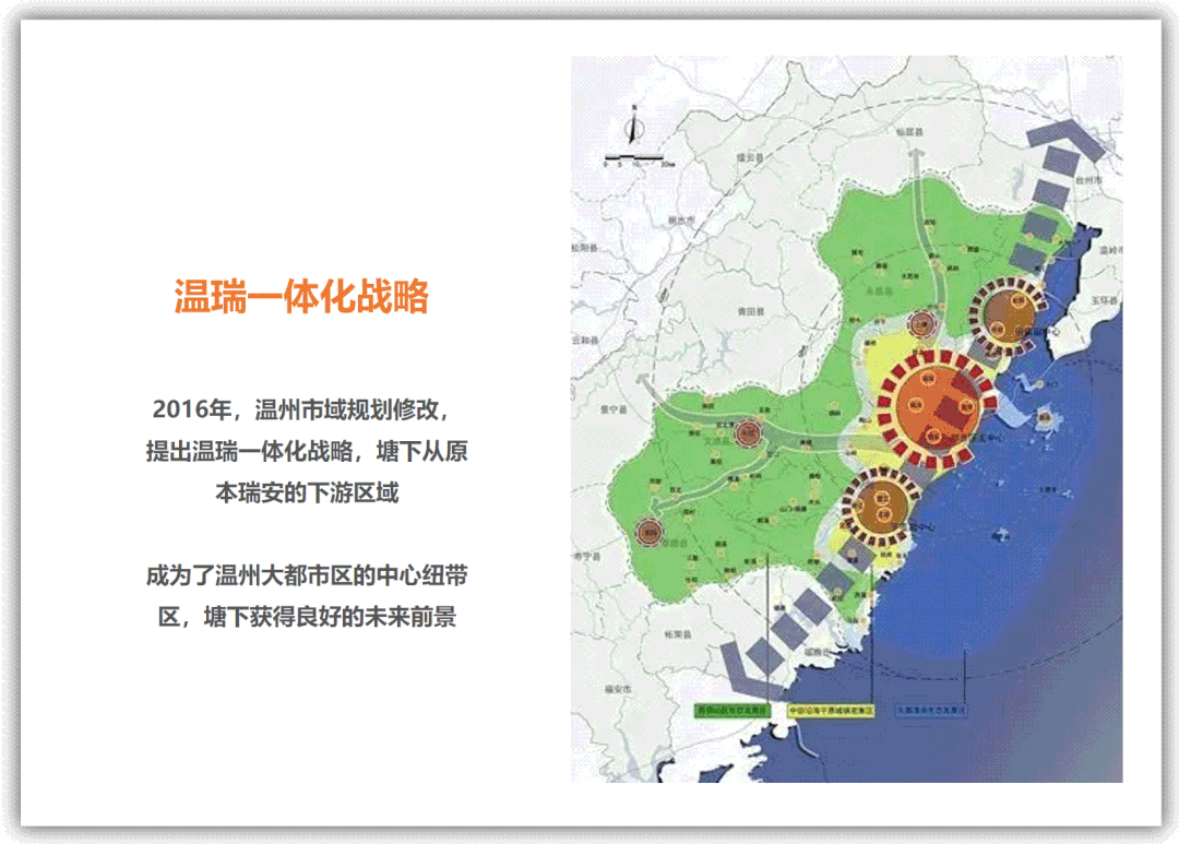 从温瑞一体化战略、定位/交通/动能/人居升级、区域位置、地段价值、景观价值等五个部门,由宏观战略到具体地理位置,详细的阐述了美庐项目的背景。