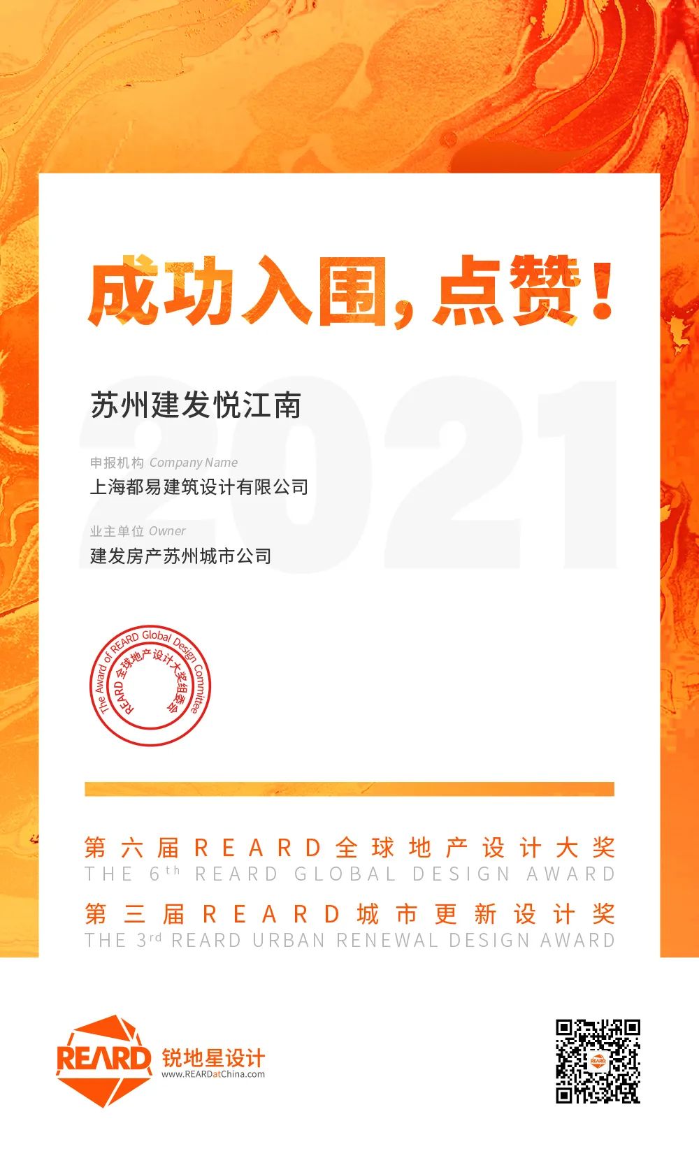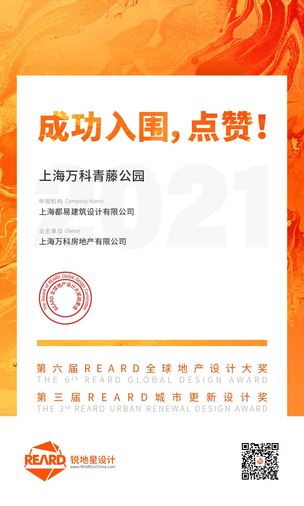 都易荣誉|两大作品入围第六届REARD全球地产设计大奖 2021年10月13日,收到第六届REARD全球地产设计大奖组委会信息,都易作品:万科·上海·青藤公园、建发·苏州·悦江南入围,并参与最终大奖角逐。 本届全球地产设计大奖将于2021年11月27日公布最终大奖名单,并颁发奖杯奖状。 本次REARD全球地产设计大奖于2020年12月正式启动,都易选送4个项目参赛,最终2项作品入围,期待都易作品能在最终评选中收获更好成绩。