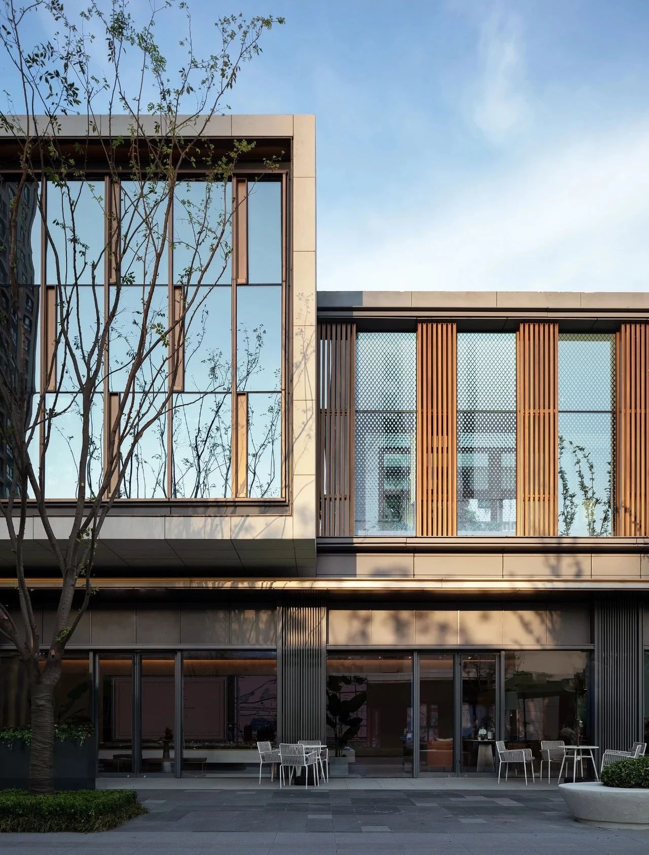 在材料的选择上,都易的建筑师继续保持着对石材的经典感和现代材料的科技感之间的平衡,比如对石材的选择呼应了前期示范区的主色调及整个都会大盘的环境;仿铜铝板的使用则突出了项目作为社区中心的温馨、充满活力的氛围;银灰色铝板、超白玻璃、以及彩釉玻璃的使用则强调了项目的现代时尚感。