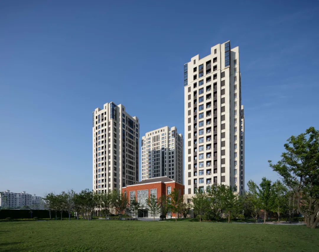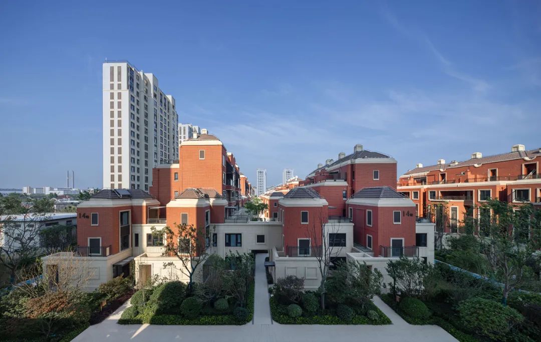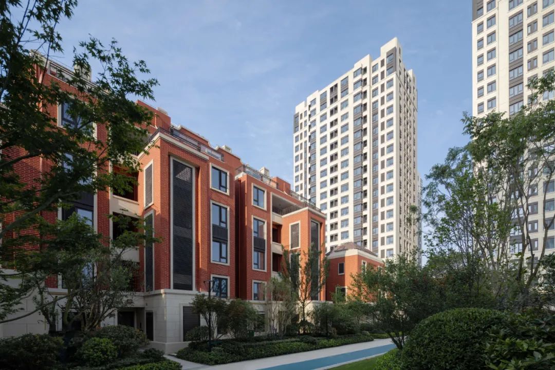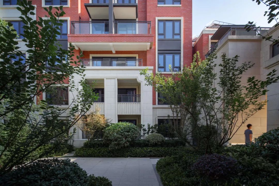 大区建筑风格为创新型海派学院风,立面设计延续了古典构图法则,强调轴线对称,立面三段式设计手法,构图强调建筑比例和尺度,主次分明,局部重点部位加入一些立面装饰元素,如线脚,门套纹理雕刻等含有历史记忆的符号装饰元素,增加建筑的风情化和人文化,经久耐看,整体给人以厚重典雅尊贵感,红砖元素的加入,给以建筑活泼的立面姿态,凸显海派学院风格的温暖感和浪漫的人文情怀。