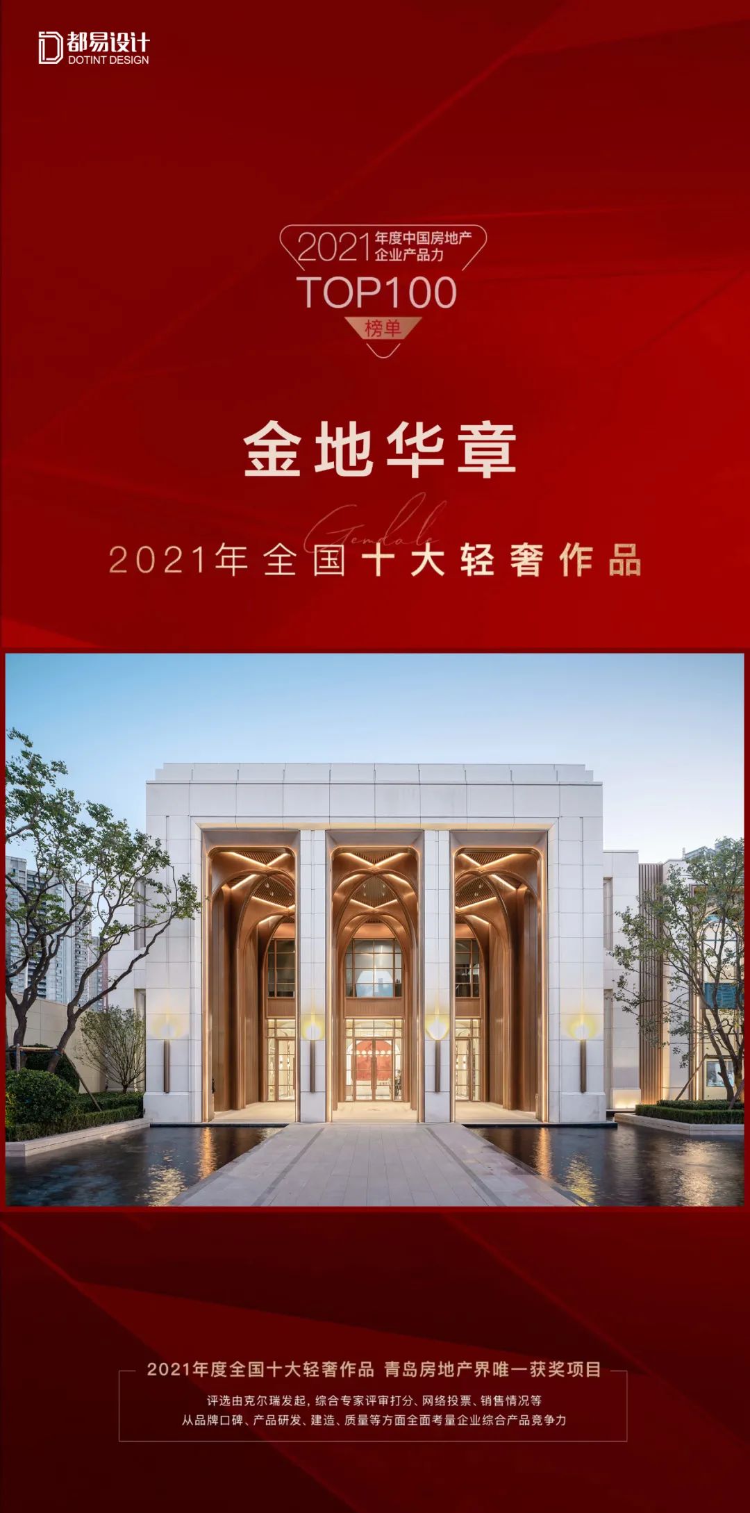 2021年11月26日,2021年度中国房地产企业产品力TOP100榜单公布,都易设计参与设计的金地·青岛·金地华章项目入选“2021年全国十大轻奢作品”,是青岛房地产界唯一获奖项目。