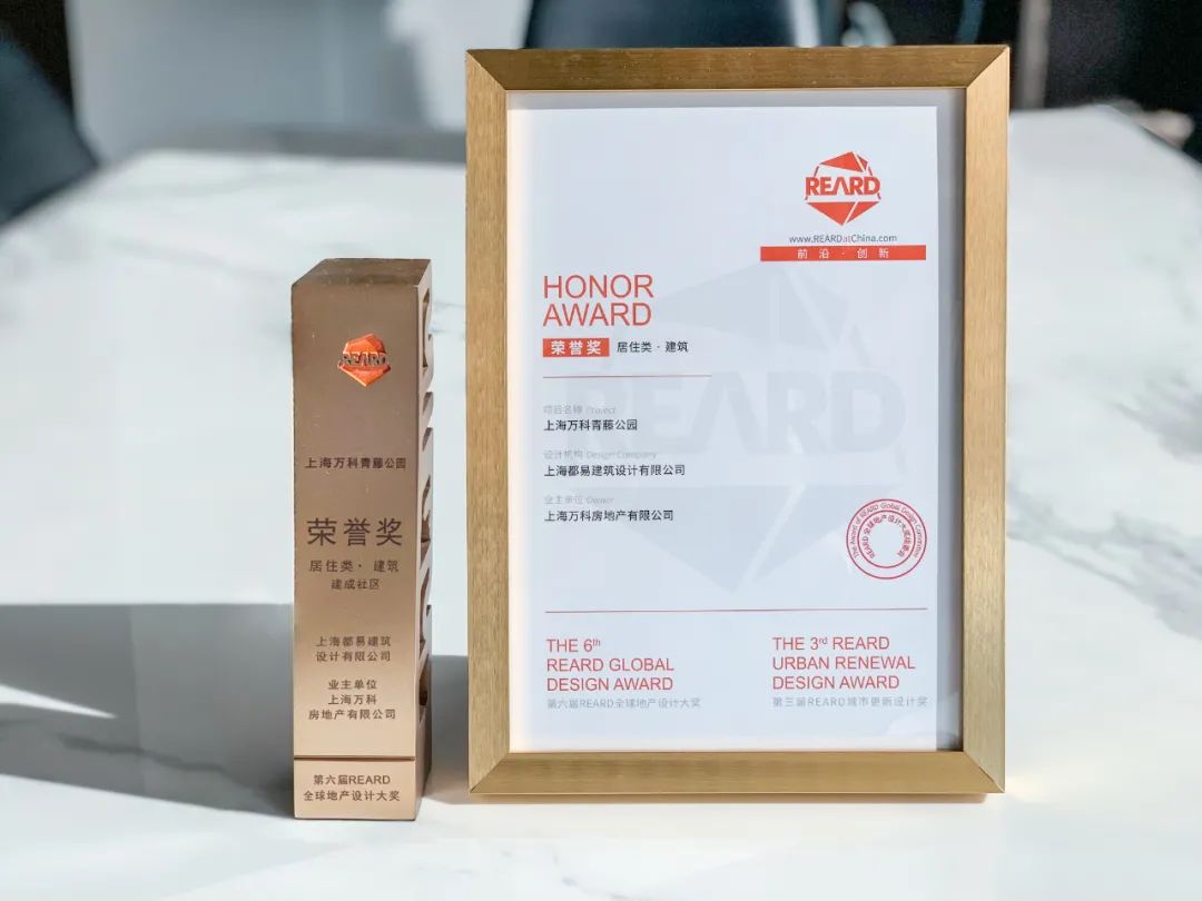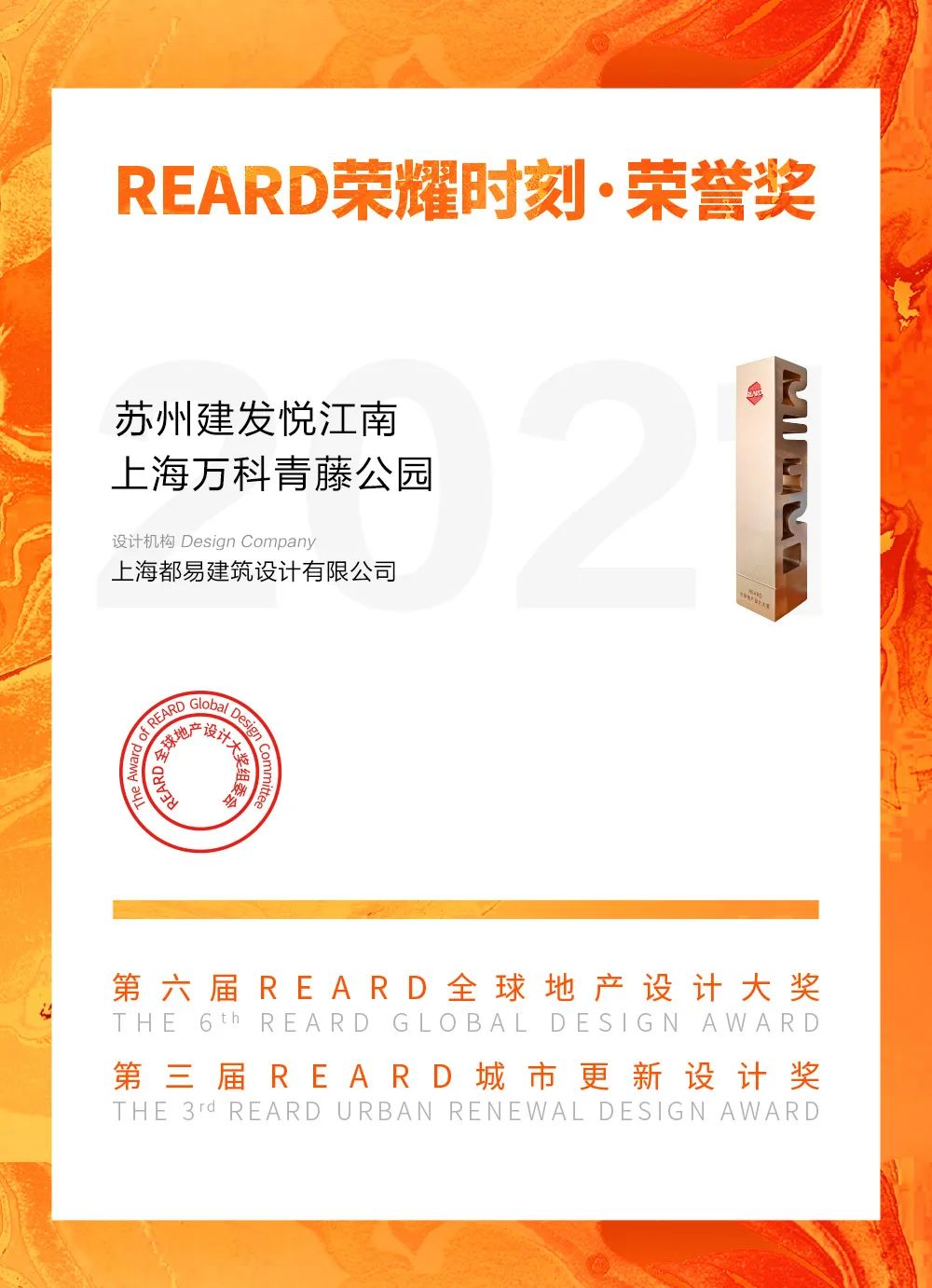 2021年11月27日,第六届REARD全球地产设计大奖公布获奖名单,都易选送的万科·上海·青藤公园、建发·苏州·悦江南荣获“荣誉奖”。