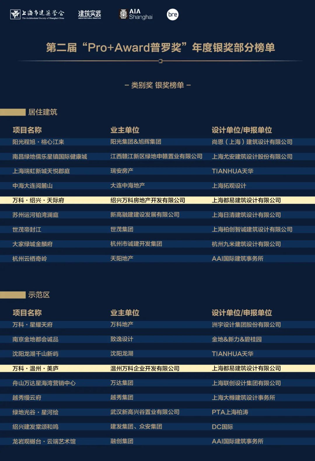 都易荣誉|荣获两项2021Pro+Award普罗奖 2021年12月17日,2021Pro+Award普罗奖公布最终获奖榜单,都易设计的万科·绍兴·天际府、万科·温州·美庐分别荣获居住建筑类及示范区类的银奖。 2021Pro+Award普罗奖收到了来自中国、美国、中国香港、中国台湾等诸多国家和地区的近千份申报作品,最终仅有321份作品入围。 大奖遵循公平、公开的原则,经由院士、大师、业内专家学者经过多轮匿名投票,都易入围两项作品最终收获银奖。 2022年都易将继续向前,不断创新研发,提升自身能力,与客户一同携手前行!!!