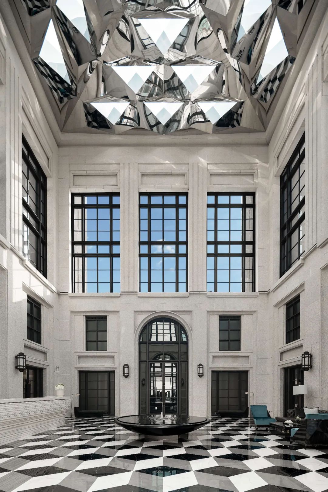 由典雅仪式门廊进入高耸的12×12×16m的钻石方厅,设计心思逐一展现,丰富的空间感受激动人心。仰望遇见惊喜。在方形模数之下引入立体三角形镜面元素,宛若钻石般璀璨,随着自然光线的变化而产生绚丽的光影变化,将空间的氛围重新渲染。都会的比例加上创新的光影与材料,原本平面的视觉空间走向立体,纵深且富有层次。