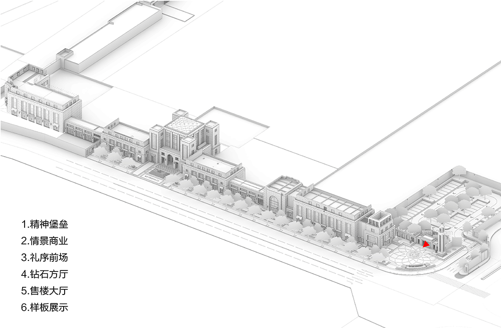 示范区的主体采用经典三段式构图,在狭促的空间下向后退让出前场空间,形成整个序列的高潮,也是整个商业街界面的视觉中心。