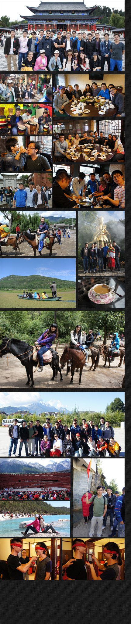 第三天,天公作美,一直阴沉多云的天气,终于放晴了。“艳遇团”来到了丽江旅游的重要景点-玉龙雪山,在天气的配合下,高原的天空充分展现了她的湛蓝,一直云山雾罩的“玉龙雪山”也展现出她美丽的全貌,引的来自平原地带的团员们纷纷拿出相机拍照留影。当天不仅游览了云杉坪、蓝月谷,还观看了张艺谋著名的“印象系列”之“印象丽江”。