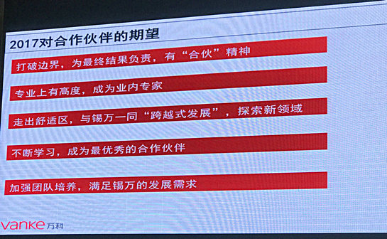会议共分三个议程:首先无锡万科营销、客服、设计、工程口高管全面阐述无锡万科2017年百亿征程的目标及对合作伙伴的期望;随后由无锡万科向合作伙伴们致以感谢;最后无锡万科总经理谭伟先生做总结发言,并与合作伙伴共同合影留念。