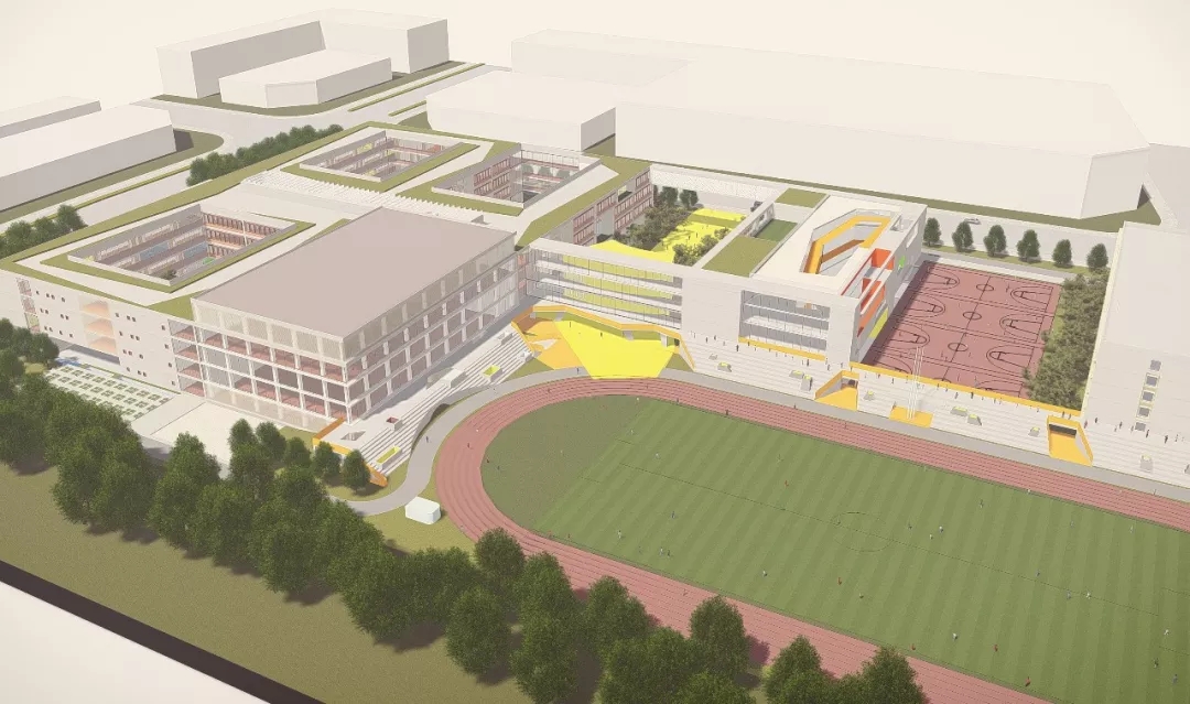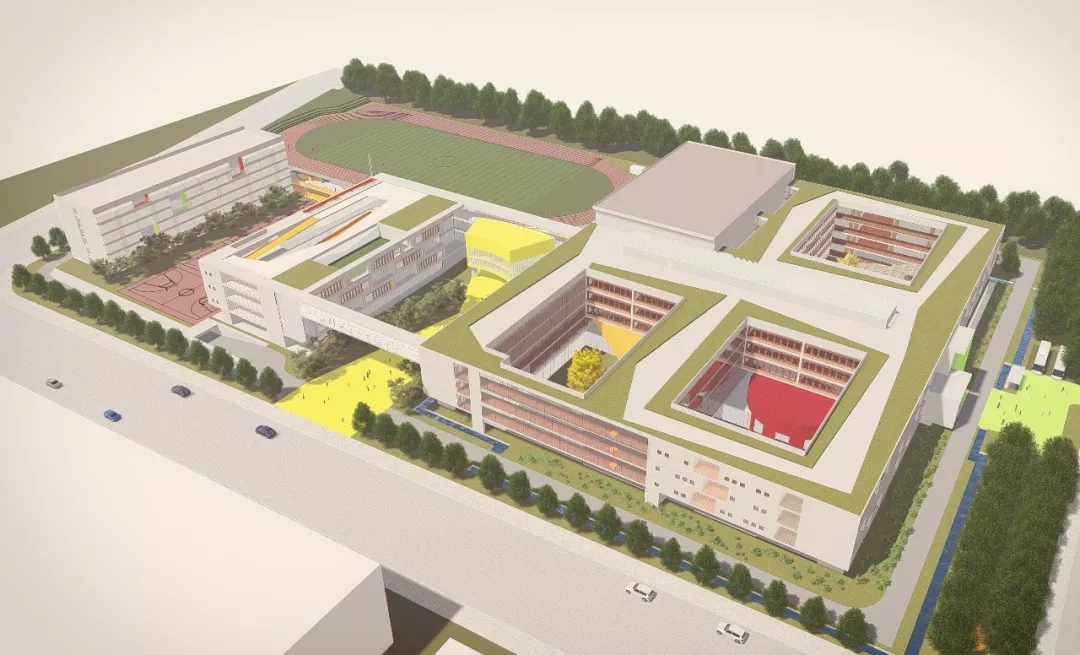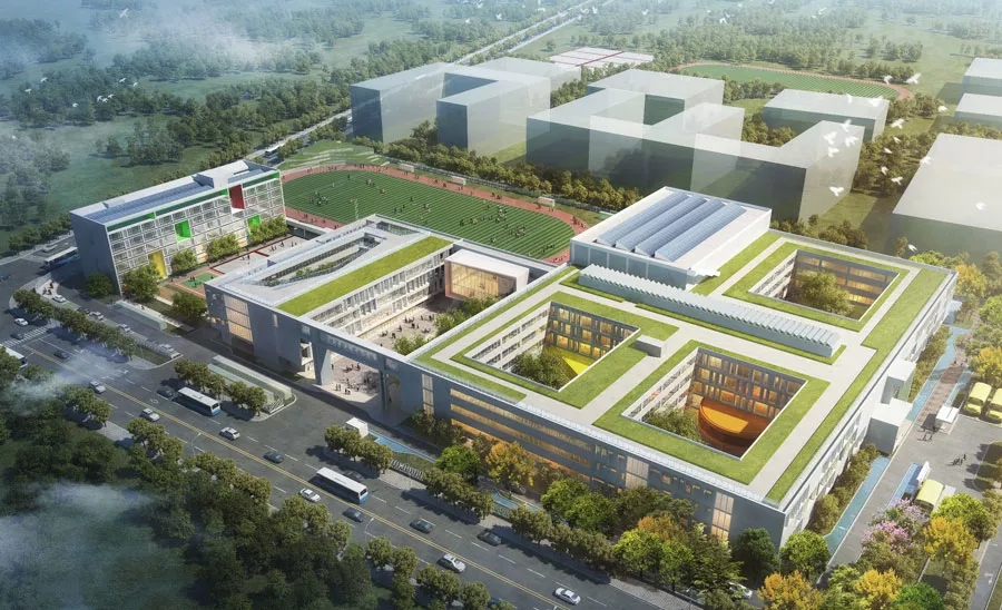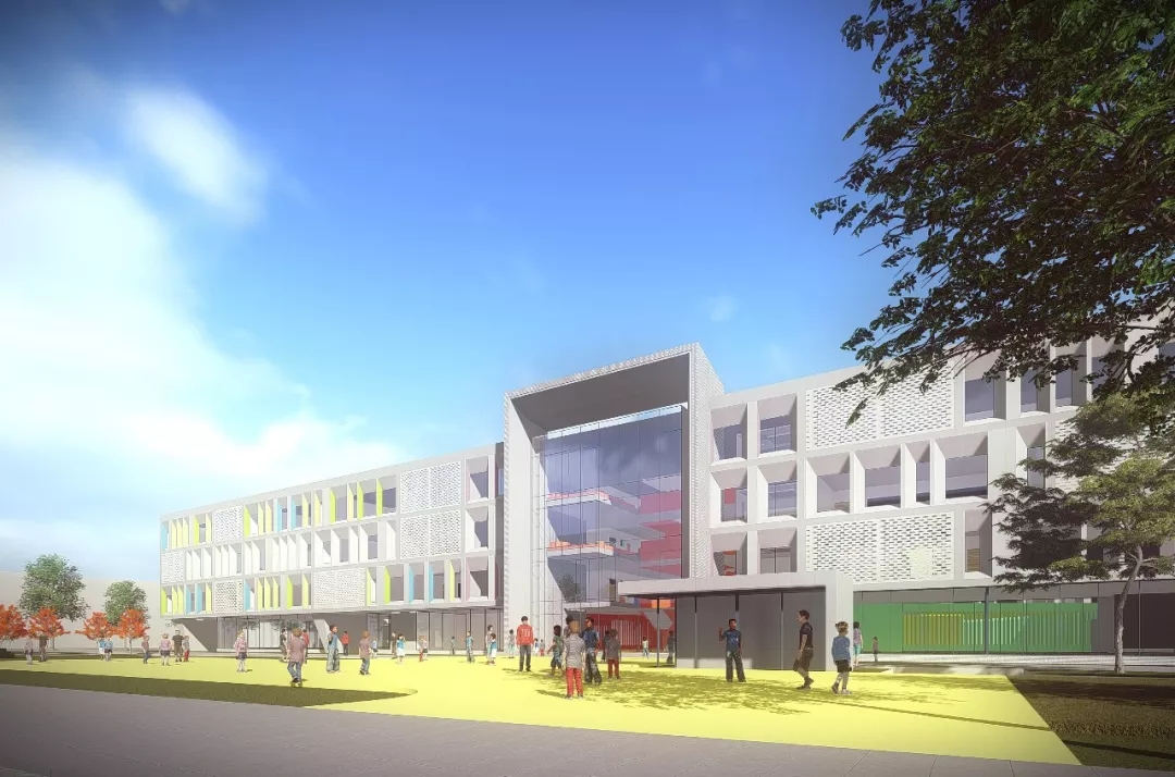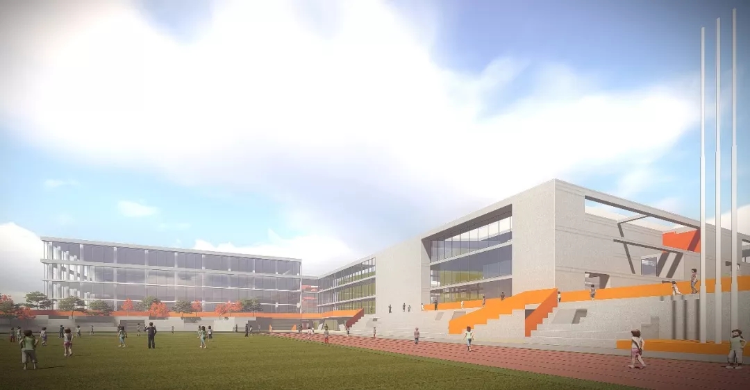 新校区包含36班小学和12班幼儿园的教学规模,建筑群的布局顺应长条形基地,按纵向分为三大功能区,从南到北依次为小学部、幼儿部和生活宿舍区操场在东北侧。建筑集群以综合体的形式把各项教学空间及辅助功能统合在一起,形成一个集约高效的教育空间。