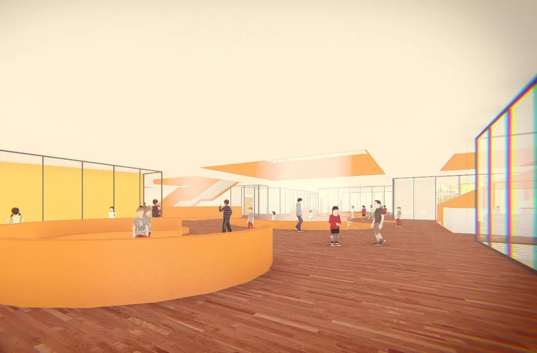 这些空间并没有被明确为某一固定功能,而是可以根据孩子们自发的行为化身为画廊,剧场,图书馆,制作间,游戏屋等等. 中庭的玻璃顶使阳光渲泄而下,映照在橙色楼梯栏板上,晕染出一片温暖,这一空间充分展现了教育空间需要的适度复杂和空间氛围的愉悦,成为本次设计的最大亮点。