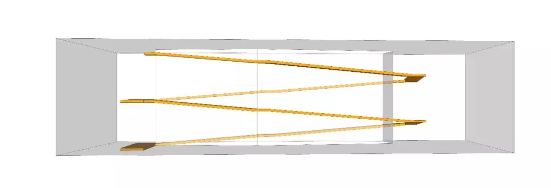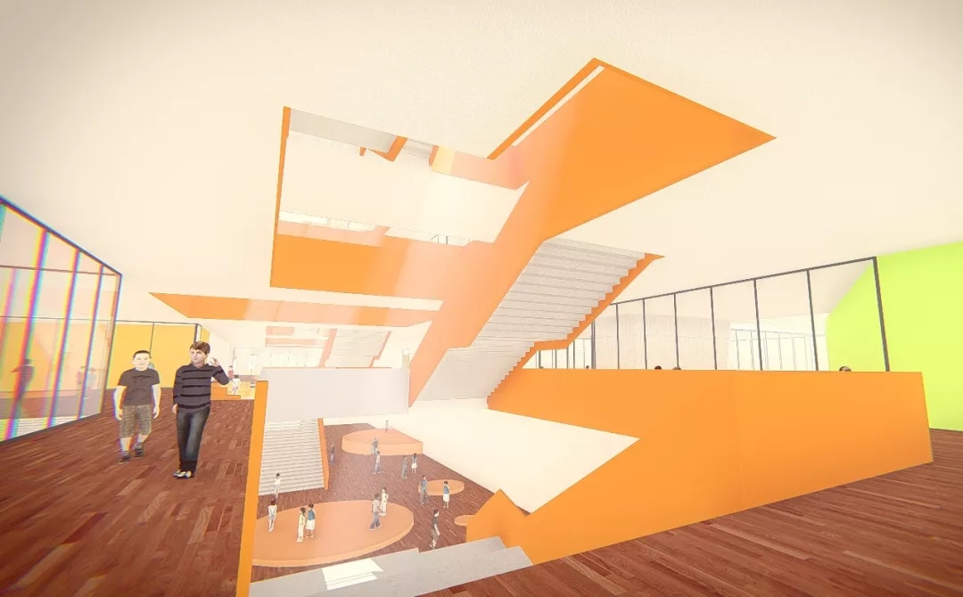 教育空间的自由和开放性充分体现在中轴的设计上,在15米面宽,88米长度的巨大尺度上,从地下直贯屋顶的五层空间里, 校园室内公共活动空间被重新定义. 三种基本楼梯原型组合为几组橘红色的楼梯群,它们悬挑于中庭之内,互相之间通过分布于不同层的放大活动平台链接,