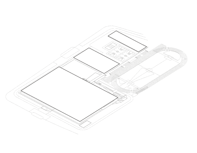 在绿化和景观的设计上,我们并没有采用惯常的设计,而是开辟了一条一公里长的越野跑道,从南入口广场开始,沿途设置了各种象征地貌,有原始森林,沼泽,绿坡,运动场,小沙漠,微型瀑布, 灌木,巨型台阶等等,。这一跑道穿越整个校园,同时结合下沉庭院,在高度上也有戏剧性变化,对学生的体力与认知提出了更高的挑战.