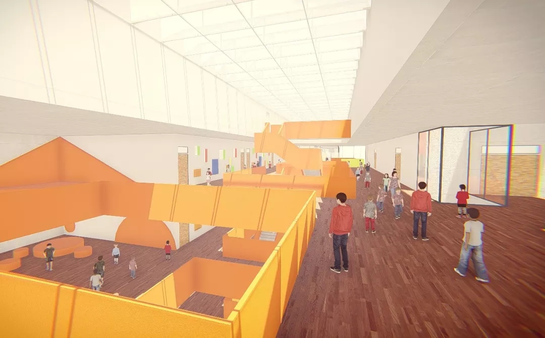 崇文实验学校的课间活动场所设计迥异于传统的学校:在传统校园,学生下课之后在走廊上聚集,走廊仅作为管道,学生像流动的水;而都易的设计则是把这些空间设计为自由港湾,它们就像海绵一样具有更强大的吸纳能力。