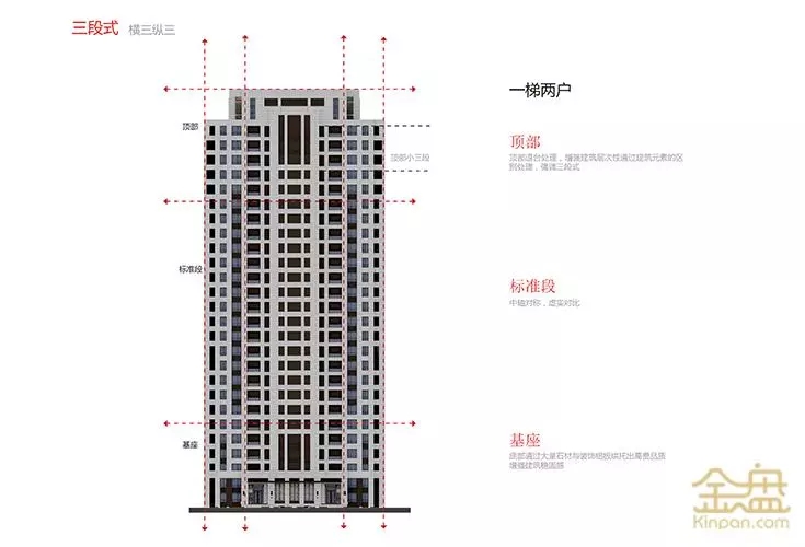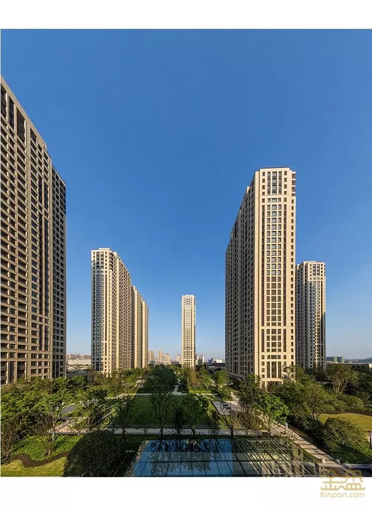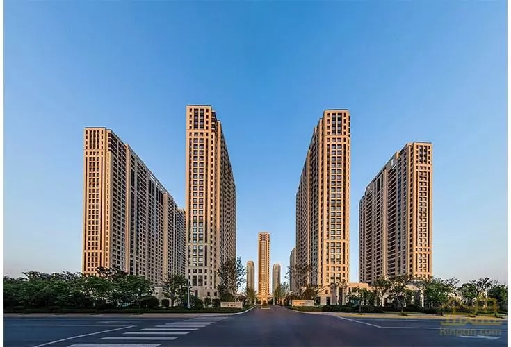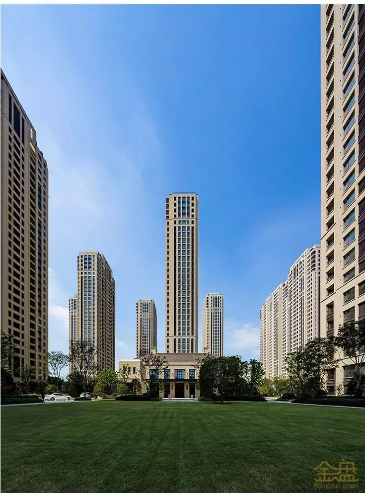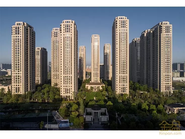 具体说来,都会风格追求一种整体感,设计采用更精炼,用更少、更有力量感的线条来表达出都市的挺拔,强调出“天际线”的“垂直感”。金辰之光中轴对称的园林布局、基于欧洲古典主义的建筑美学比例,使得社区具备了城市级的仪式感,而开放式的公共绿地则为城市增加了景观界面。在细节上,金辰之光的设计比很多古典主义社区更简洁,比起现代风格则更厚重,12座26-34层的百米塔楼分布在规整有序的地块之中,总体布局形式规整形成和谐的建筑韵律,建筑单体的四个立面保持均衡(与仅刻画南立面的普通居住社区有很大的差异),形成一眼可辨识的高品位风貌。