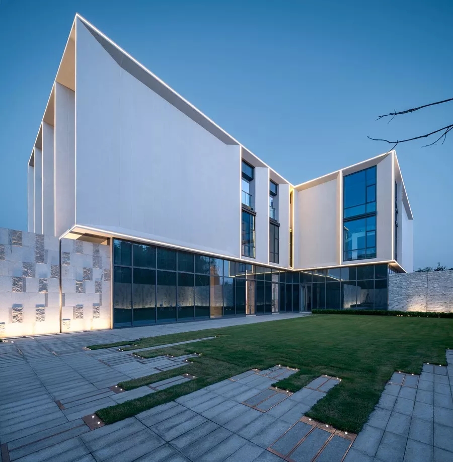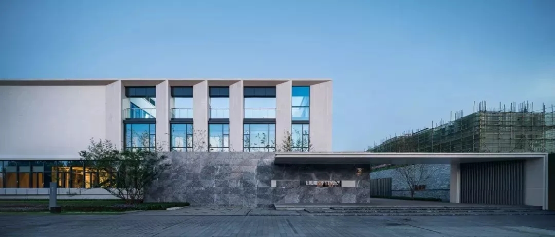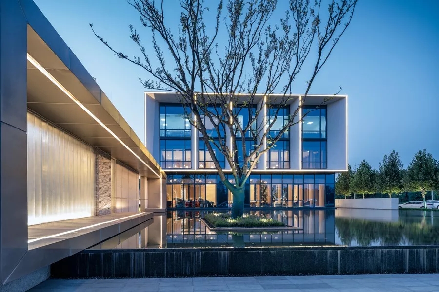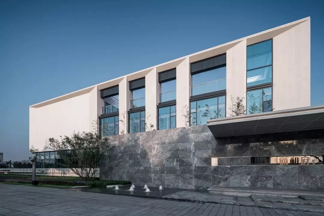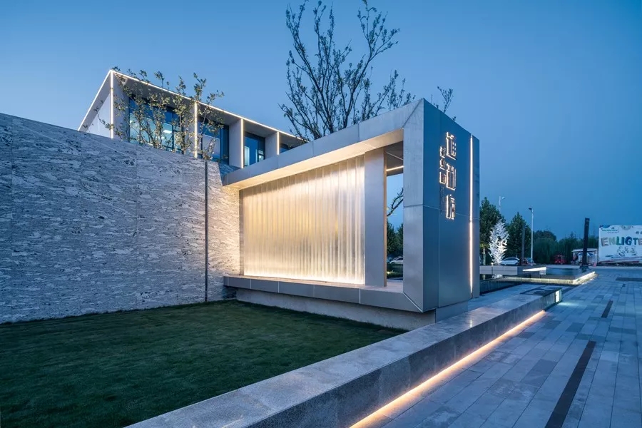 主体建筑的形态非常简洁,建筑立面的设计手法强调了光影的效应,规整有序的石材和玻璃,在虚实对比之间,营造出皮影戏一般的美学张力。石材的切割拼缝与玻璃的模数分割,契合的非常严谨,遵循着现代建筑的模数法则。建筑二层与三层的立面分割形成一组组别致的“景框”,加强了示范区与城市的积极对话关系。一层通透的玻璃在傍晚亮灯之时,仿佛将建筑浮于水面之上,远观,令人浮现翩翩,而近赏,亦有着极强的韵律感。
