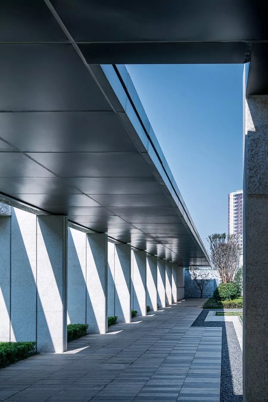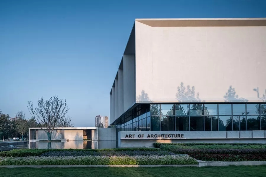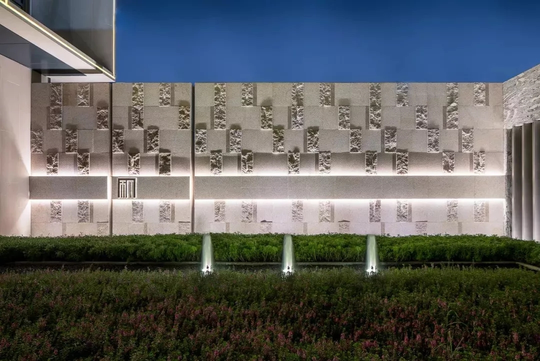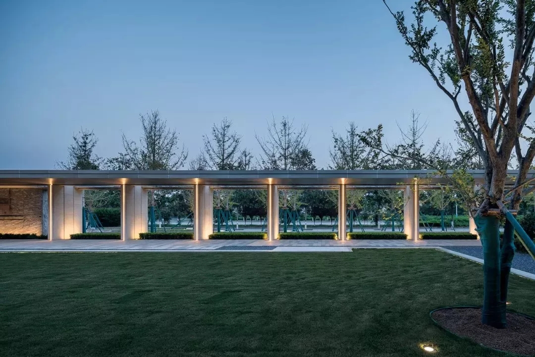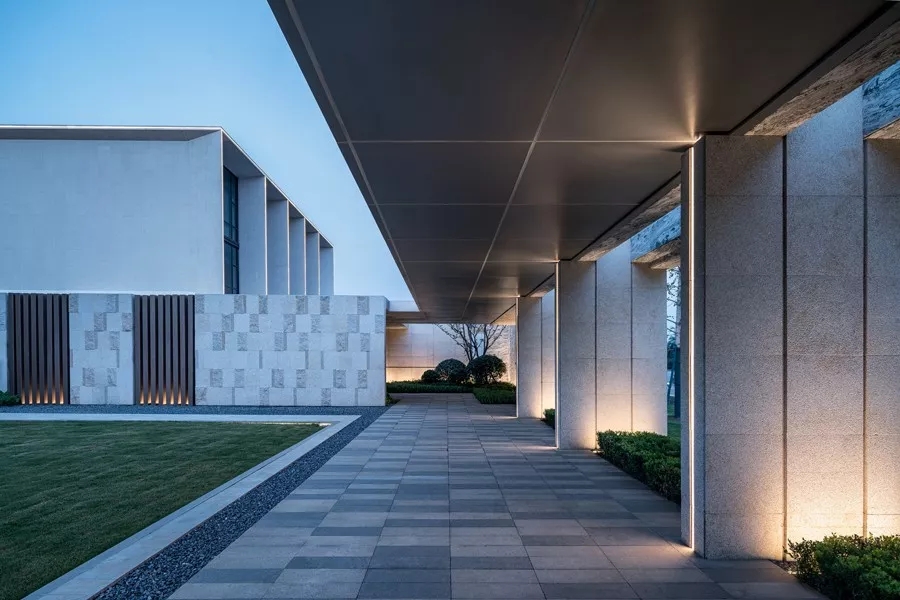 在依水空间,纯净的建筑在如镜面一般的水面映衬中显得有了几分柔情,诉说着这座城市的历史变迁,人来人往。而在花香鸟语之中,又能为生活平添几分闲适自然。而在过渡空间,先小后大、先抑后扬的设计手法,通过景墙虚实结合将空间分割,给人空间的收放体验;与建筑元素统一的墙体连廊柱式,将光线从缝隙中透过,使空间更有韵律感。