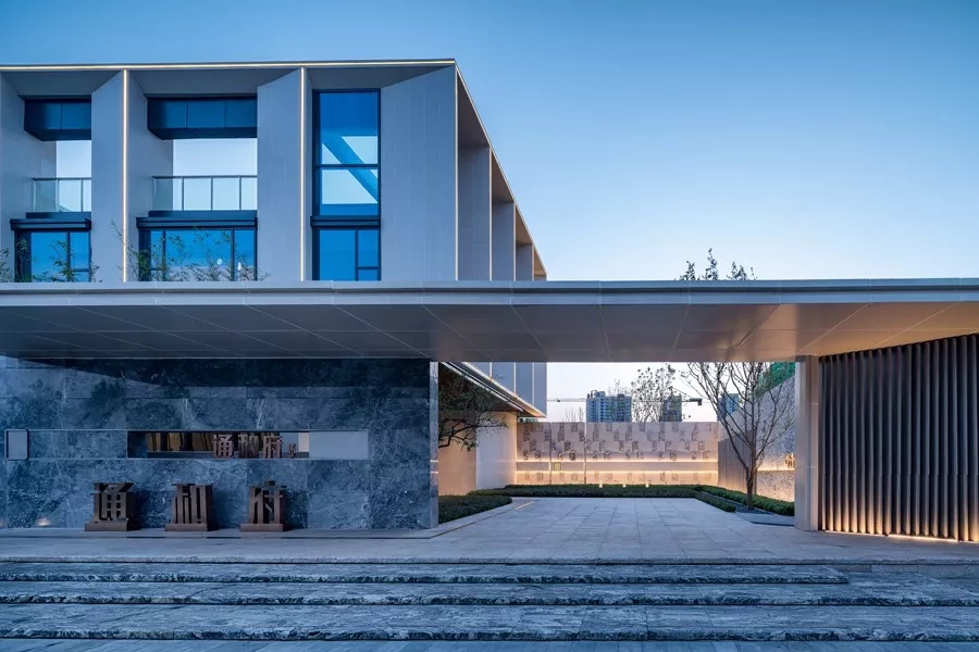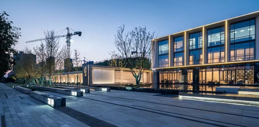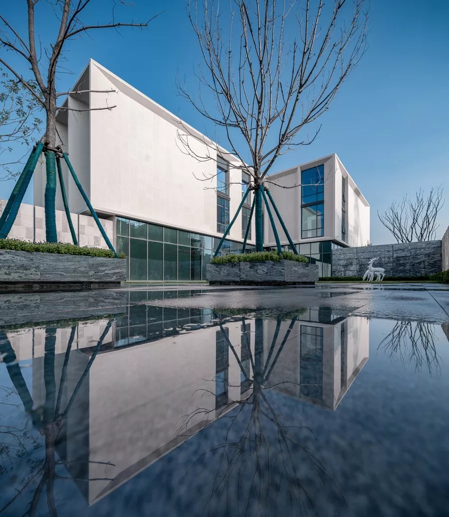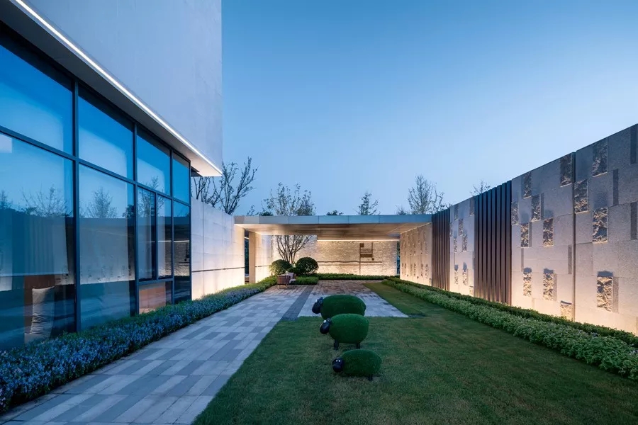 【庭院】样板区和展厅主体建筑之间的庭院,与城市道路形成开放通透的对望关系,是整个布局中的点睛之笔