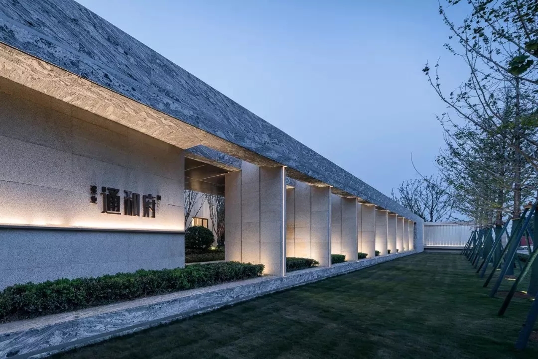 从规划布局上看,通河府的示范位于整个地块的东南角,南部为城市景观界面和样板房,北部为临时停车场,转角之处为一方宁静的水面,三层体量的示范区主体建筑架于水面之侧,不论建筑或是景观,皆与城市道路保持着谦逊的距离。