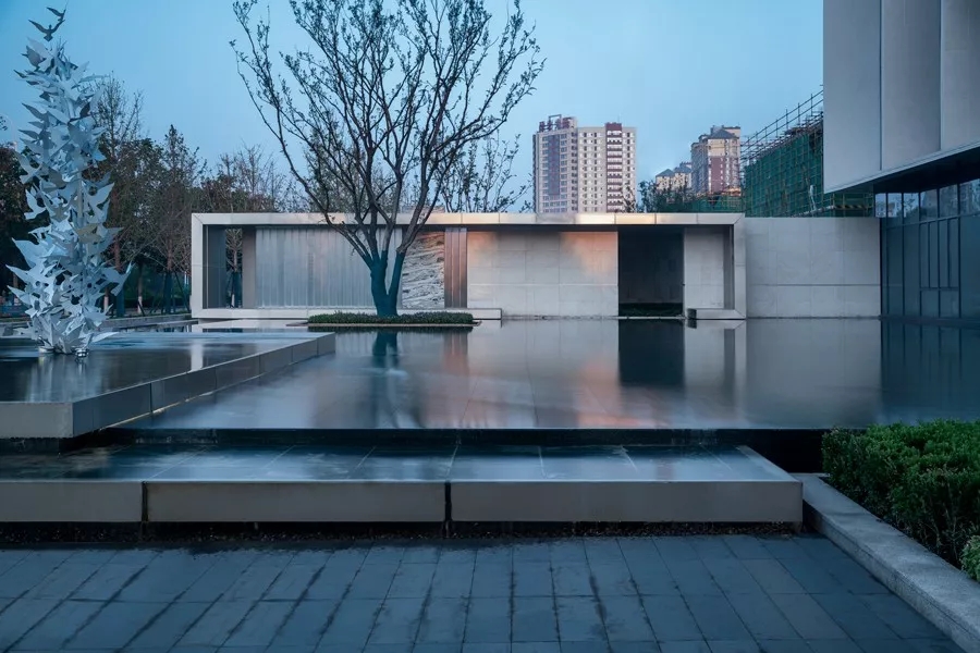 在空间规划和建筑语言确立之后,景观作为规划意图的另一层面的延续,在空间体验中起到了至关重要的作用。设计师充分考虑了濮阳的地理气候特征、植被环境、消费者对景观的偏好、以及未来美学的趋势,将“少即是多”的经典原则贯彻其中:山石、格栅、景墙在简洁组合之中层层递进,结合院落展开多重叙事。