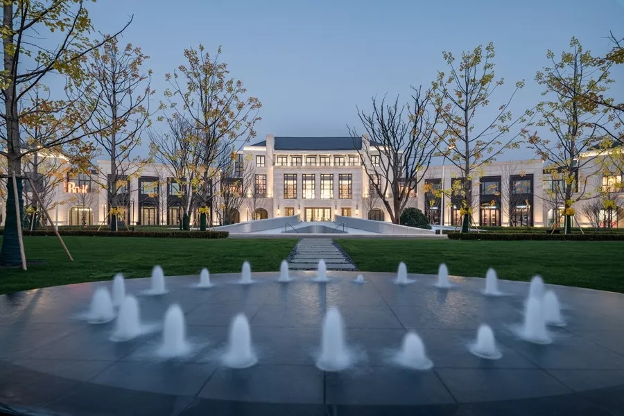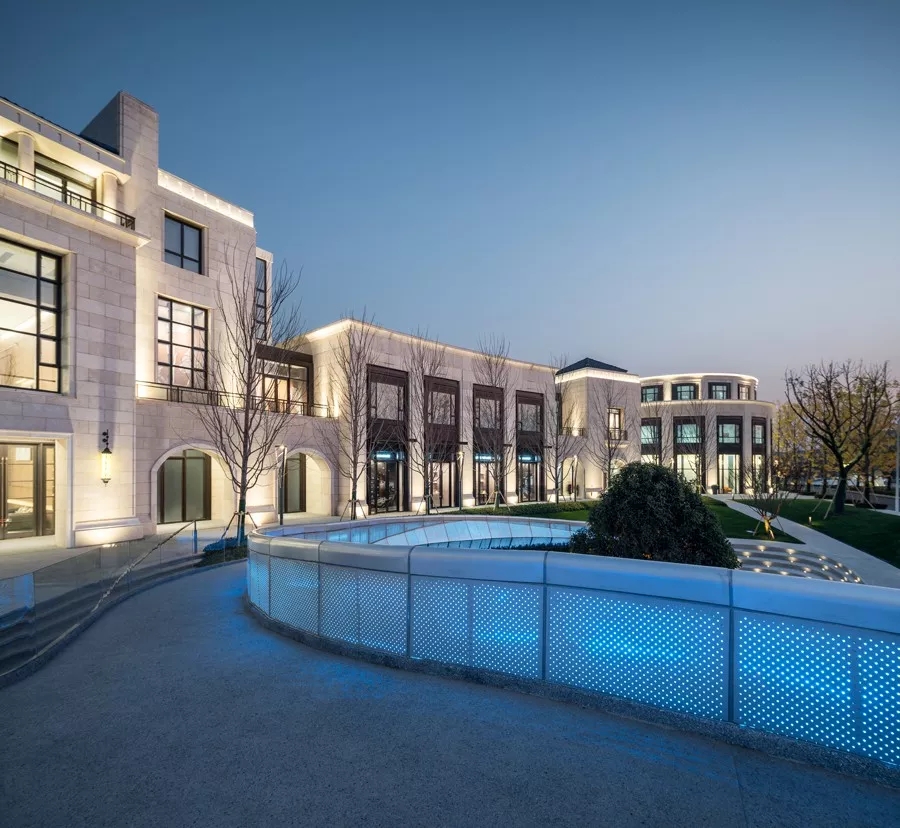 示范区的中央建筑是整个建筑序列的核心,在两侧对称的过渡空间的烘托下,显得尊贵而端庄。从立面的细节上来欣赏这座建筑,可以看到一层的拱廊、二层的挑高玻璃窗、三层的圆形柱廊共同形成了立面纵向的韵律,而横向三段的韵律也通过建筑收头和屋顶的处理而分外典雅。