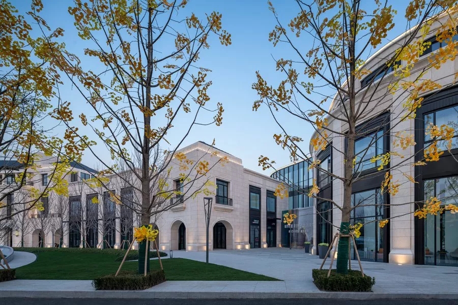 示范区的会所空间(未来运营为社区活力中心)被设计成集中式、弧线型的建筑形式,一方面易 于围合出一个有古典气质的入口广场,一方面也有利于未来的日常运营。示范区为社区图书馆、幼儿园、垃圾中转站、零售空间、健身设施等高品质生活需求预留了足够的空间,随着社区的分期建成入住,中心的服务设施可以进一步沿着中央轴线加以扩展。