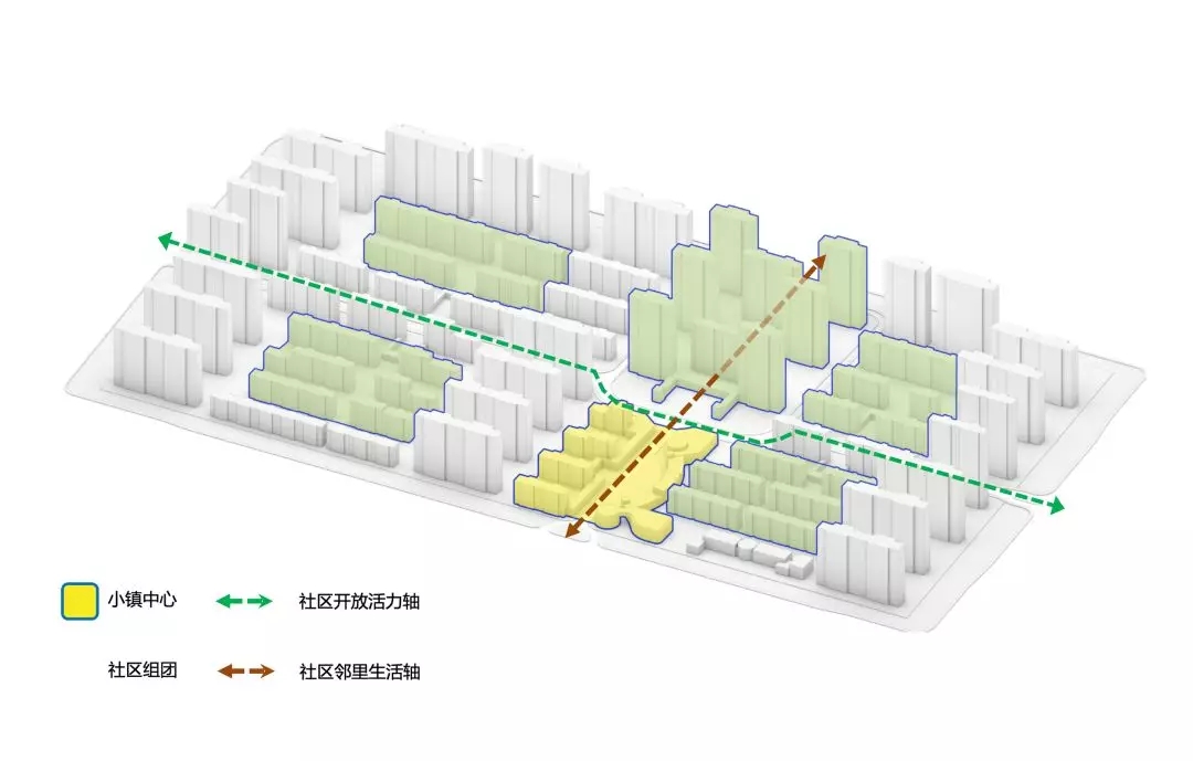 社区邻里生活轴线(纵轴):社区纵轴由社区入口公园、社区生活中心和中央公园构成。纵轴沿线链接了社区生活中心和横向的带状开放公园,成为社区生活的核心空间。各类主题空间汇集于此,共享、聚会、学习、办公,构建出一种活力的都会生态系统。