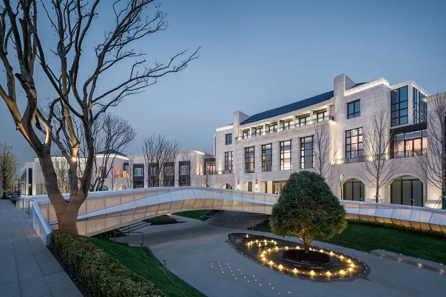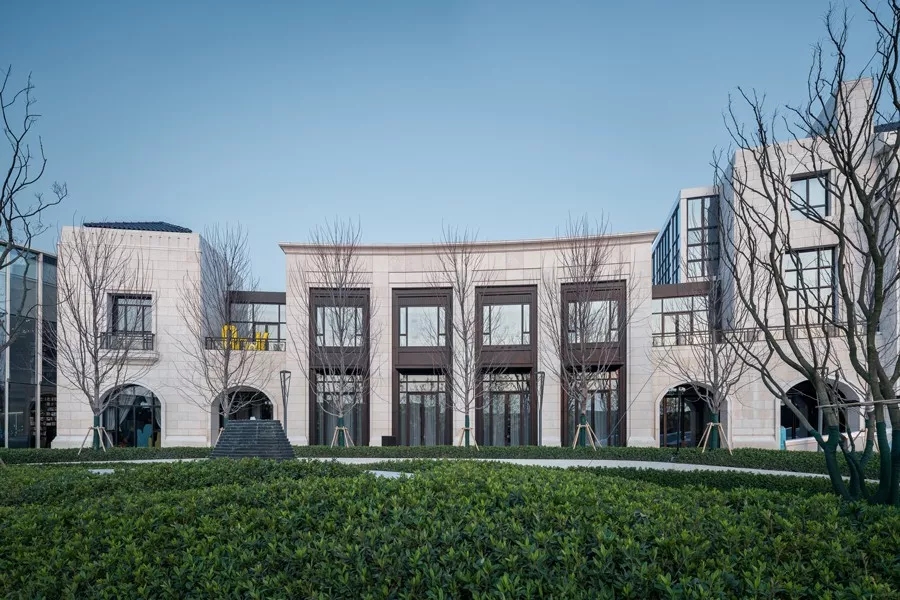 连接着圆厅建筑与中央会所的是一组二层的过渡空间,上下层整合的金属门窗来凸显出精致的序列感,而在一层局部开放的拱廊则使得整个建筑与景观有了对话的空间。