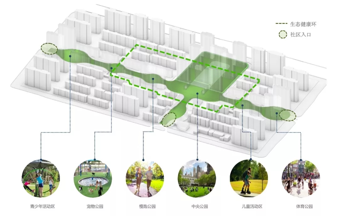 公园体系:利用周边的景观资源、红线外公共绿地与小区内部公共绿地空间整体打造。