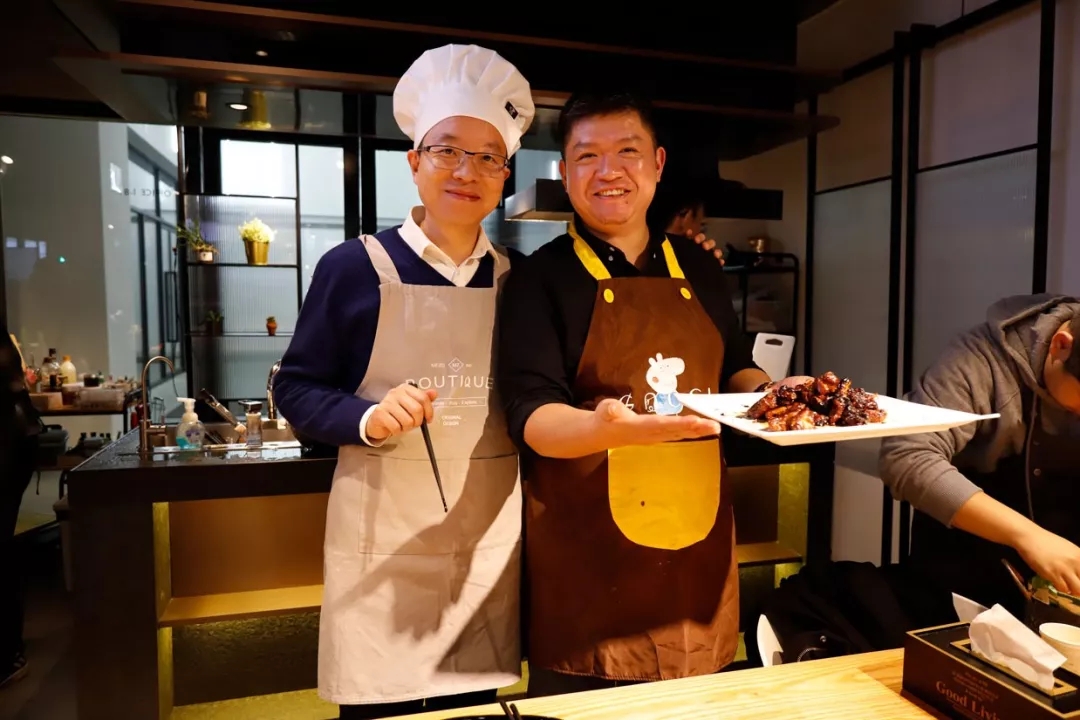 大家调整好状态后,在一楼的料理区集合,料理区共分为四个料理吧台区,【都易伐木累】的小伙伴们分成了四个团队,来分别料理自己区域对应的菜品,菜单是中西结合,既有传统的“红烧肉”、“糖醋排骨”,又有西式的“火炙三文鱼沙拉”、“俄式浓汤菜”。