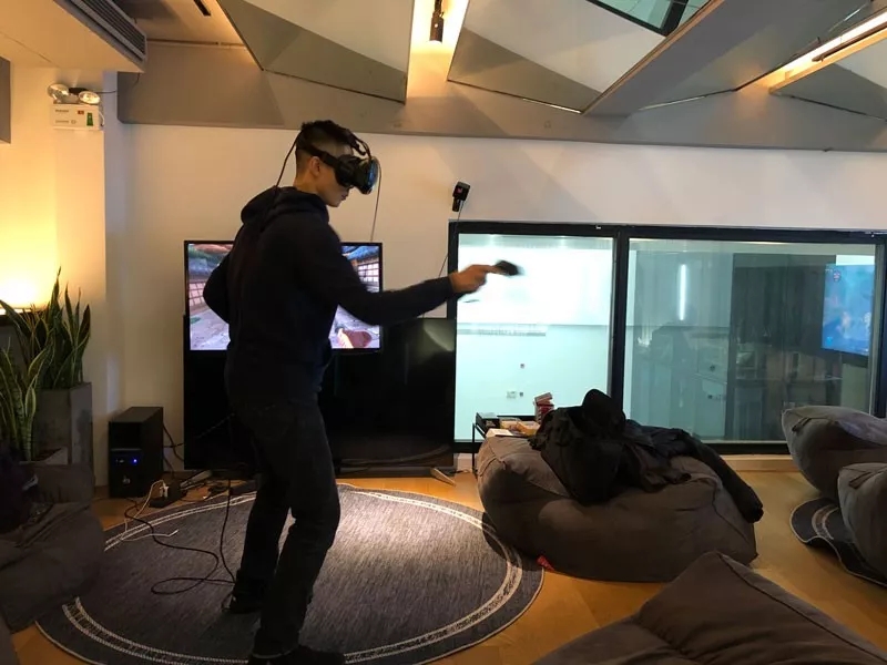 正式烹饪之前,都易小伙伴们在教室二楼的轰趴区,畅玩桌上足球、SWITCH游戏机和VR游戏,放松工作中的压力,舒缓心情,为制作当晚的珍馐美味充分做好准备。
