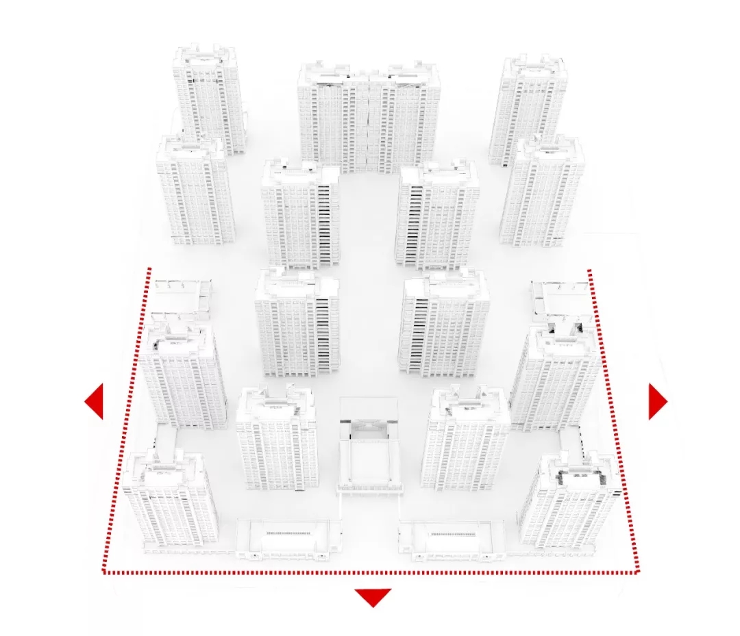 在进一步的设计中,城市广场和城市客厅的概念被引入社区,结合地下车库与首层架空,形成地下、地面、社区空间的三重立体景观空间。特别值得一提的是社区,中部四座高层建筑的首层全架空设计,打造渗透式景观概念,在很大程度上扩大了景观轴线和社区公园的“城市化体验”。