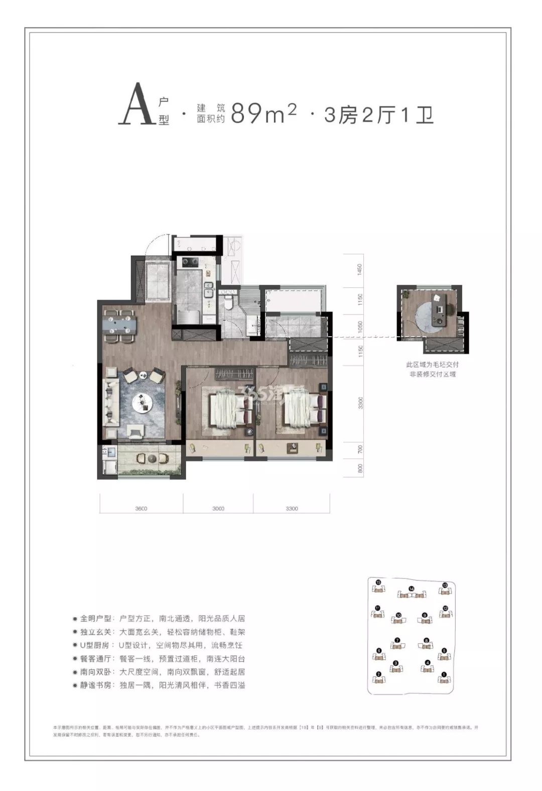 位于高层塔楼中部的A户型,面积约89㎡,配置了三室两厅一卫的基本分区。不仅三室朝南,还同时具备独立玄关、多重收纳空间,全明的U型厨房等空间优势。巧妙之处是在阳台、设备平台、飘窗位置获得10㎡的附赠面积,这些空间可以极大的拓展了小户型产品的适应性。
