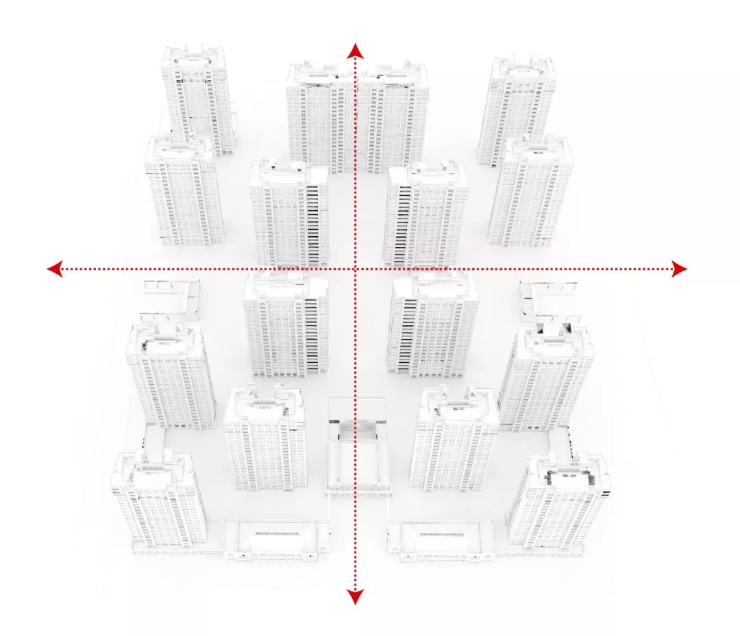 从南侧主入口开始,一纵一横两条主轴形成了整个社区的基本格局。布局规整的双轴线,呈现出一种开敞的都市尺度。主要轴线之下,再分支次级轴线,将景观逐级渗透到各个户型组团单元。