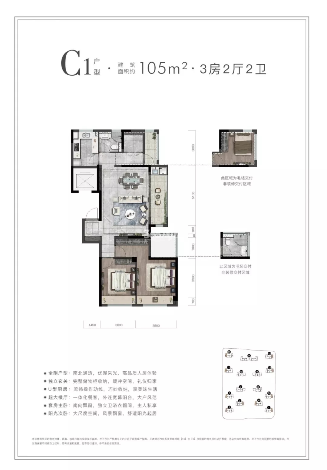 位于建筑端部的C户型面积约105㎡,在市面上小型三房产品(三室两厅两卫)的基础上,大幅提升了居住舒适度。结合大都会风格对东西两侧立面的开窗设计,大面宽的客厅更好的将室外风景引入室内。主卧配有双面采光的卫生间,堪比很多都市豪宅的配置。此外,多处累积赠送15平米的面积进一步提升了产品设计的性价比。