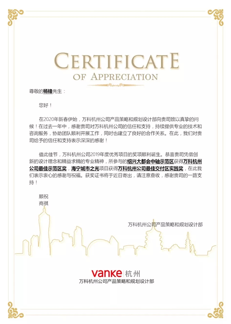 双双获得杭州万科嘉奖