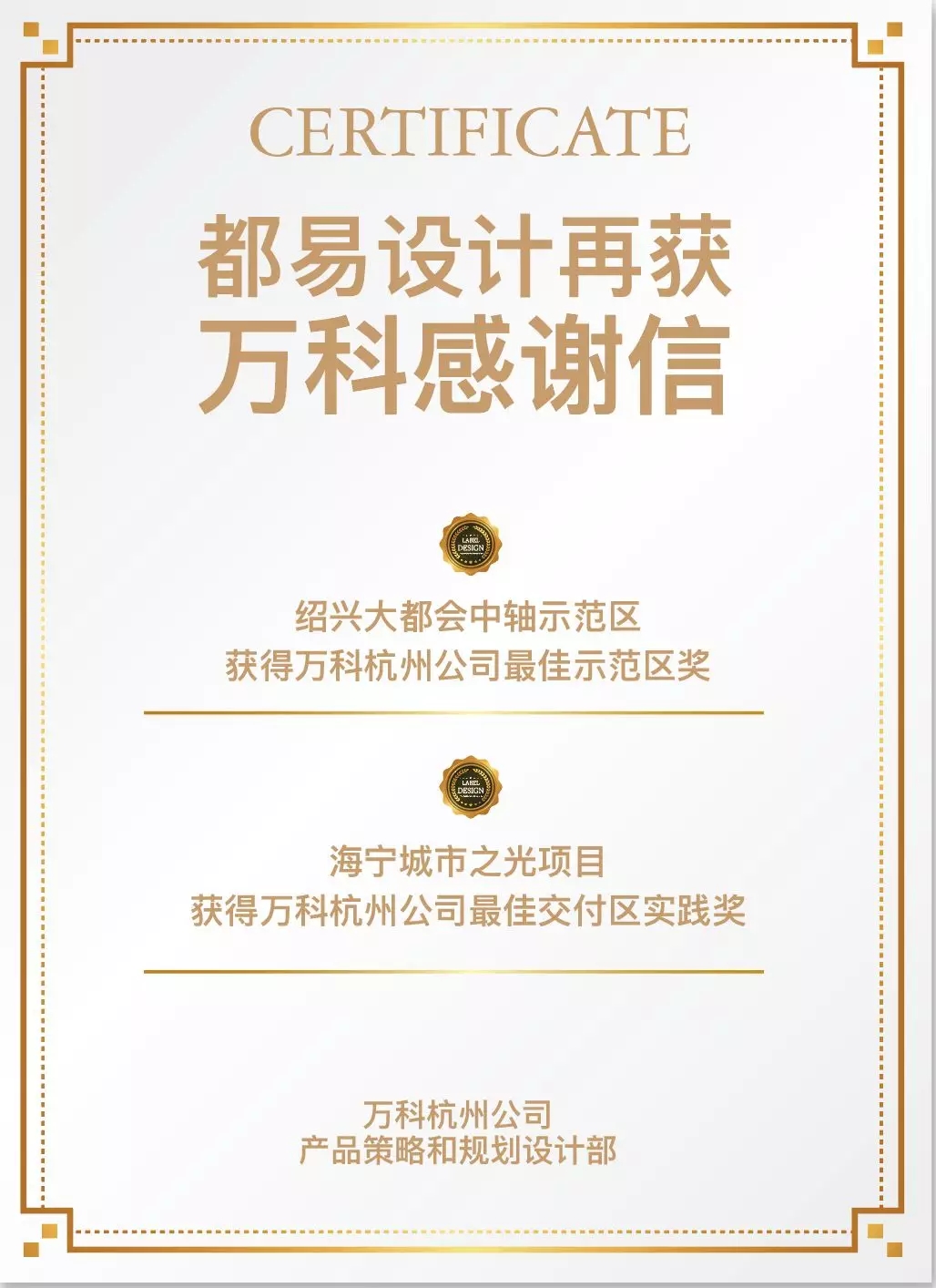 都易荣誉 | 都易设计再获万科感谢信